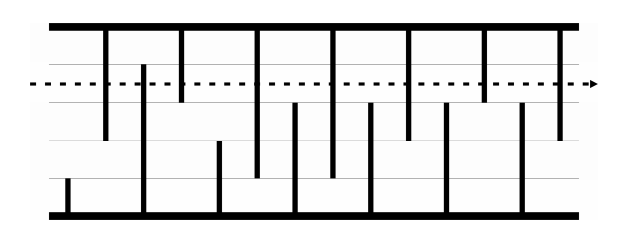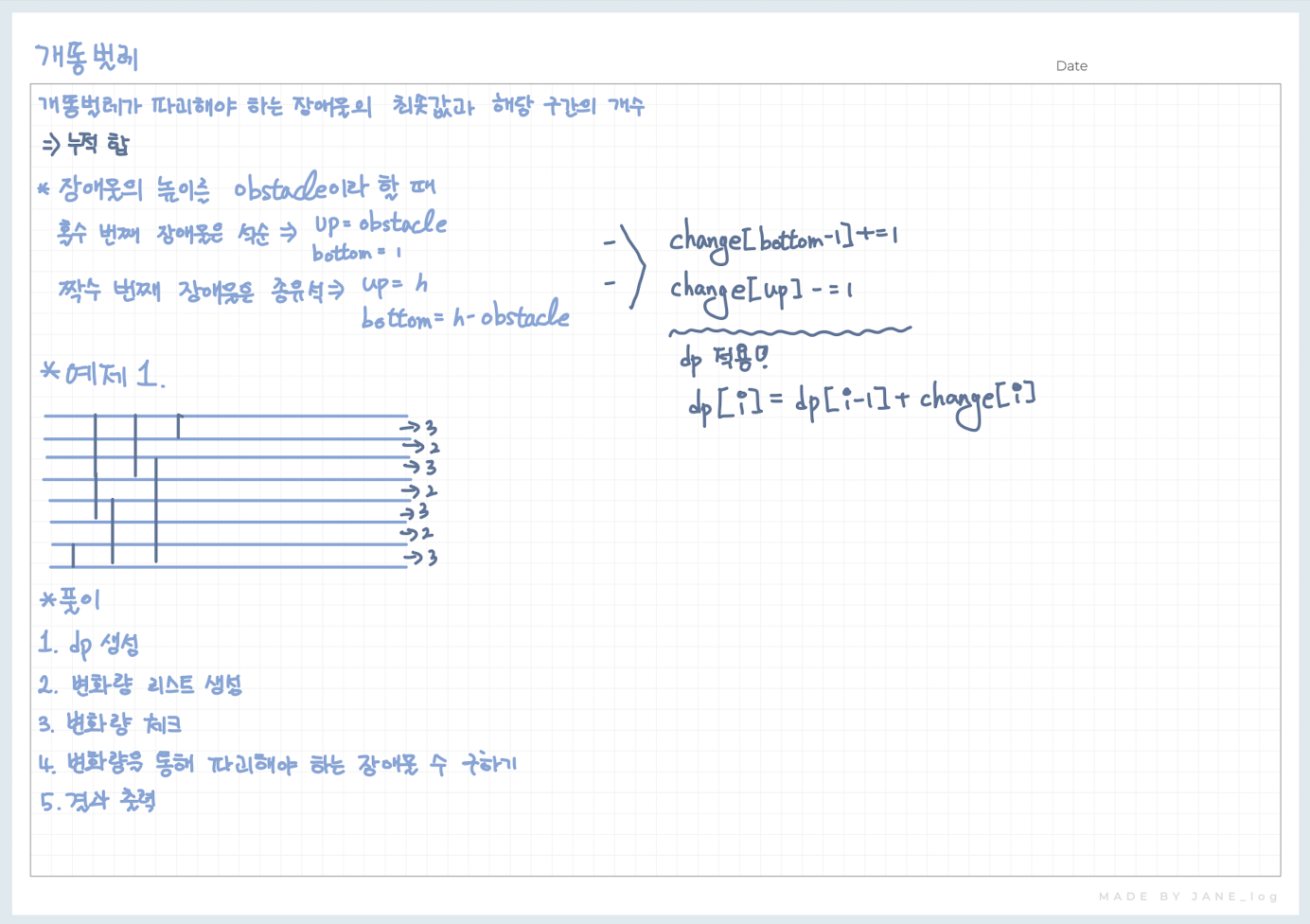 개똥벌레 한 마리가 장애물(석순과 종유석)로 가득찬 동굴에 들어갔다. 동굴의 길이는 N미터이고, 높이는 H미터이다. (N은 짝수) 첫 번째 장애물은 항상 석순이고, 그 다음에는 종유석과 석순이 번갈아가면서 등장한다.