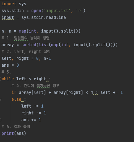 첫째 줄에 견학을 희망하는 학회원의 수 과 견학하는 팀의 최소 능력치를 나타내는 정수 이 공백으로 구분되어 주어진다. (1≤N≤100000, 1≤M≤10^9)