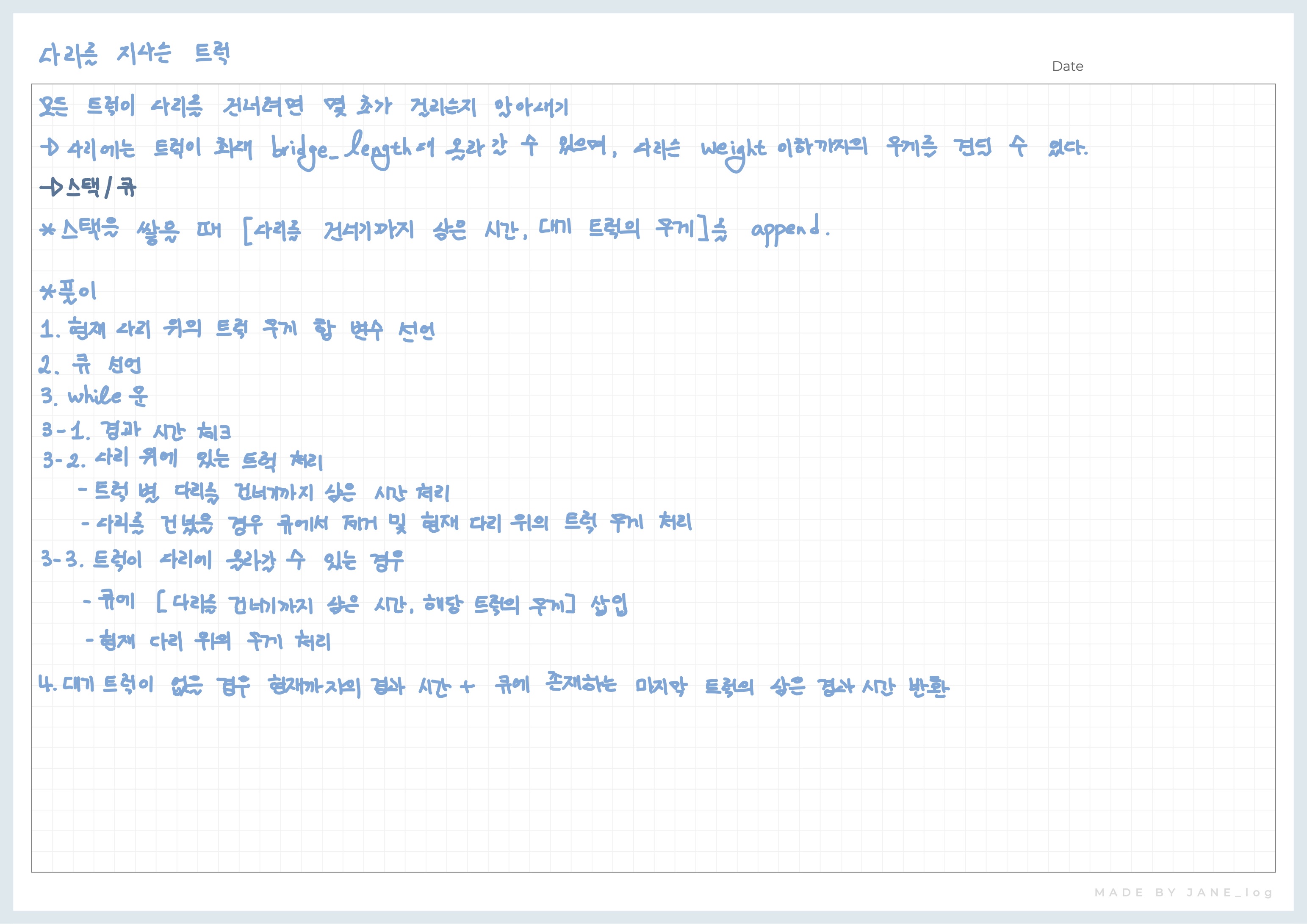 트럭 여러 대가 강을 가로지르는 일차선 다리를 정해진 순으로 건너려 합니다. 모든 트럭이 다리를 건너려면 최소 몇 초가 걸리는지 알아내야 합니다. 다리에는 트럭이 최대 bridge_length대 올라갈 수 있으며, 다리는 weight 이하까지의 무게를 견딜 수 있습니다. 단, 다리에 완전히 오르지 않은 트럭의 무게는 무시합니다.