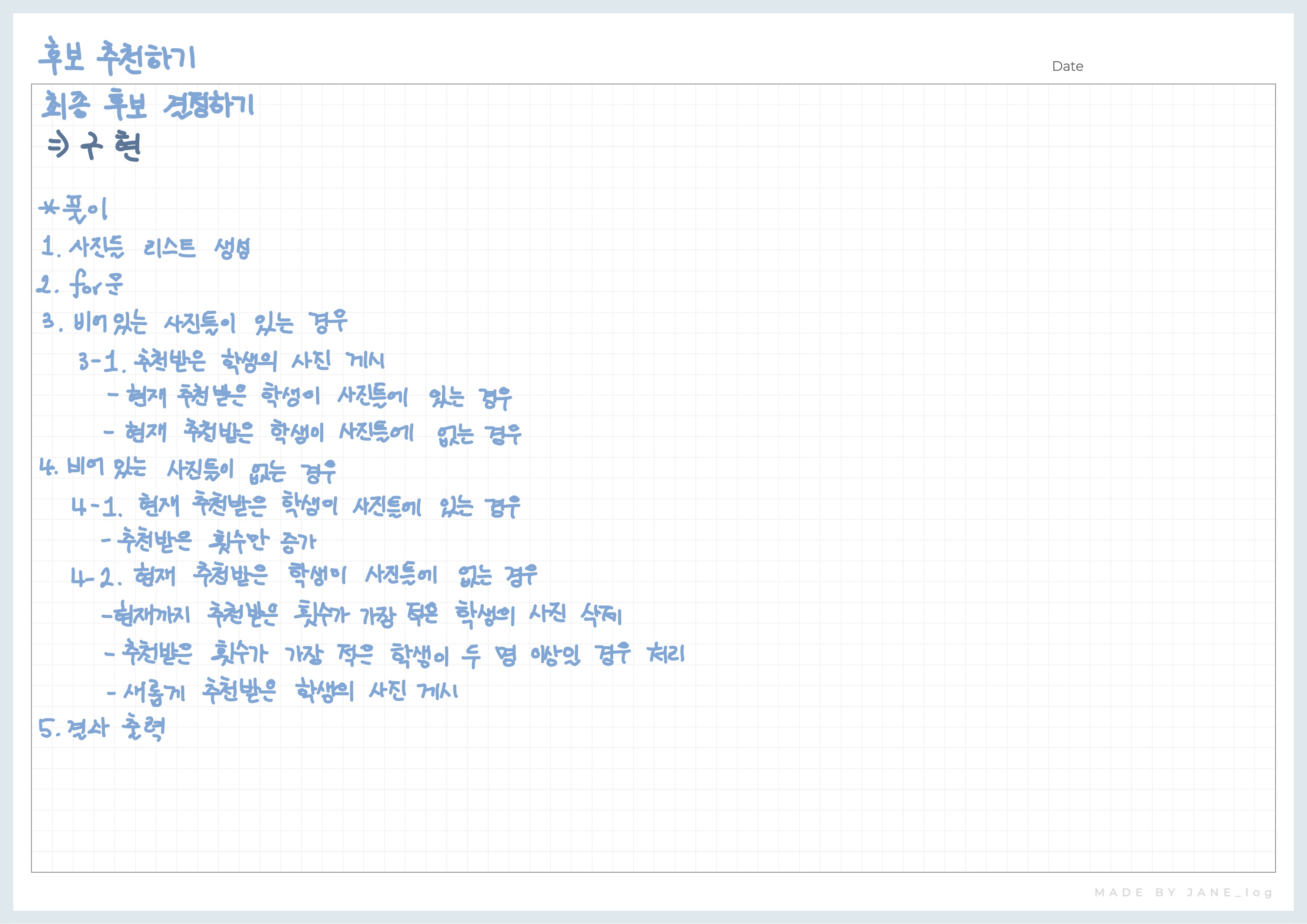 - 어떤 학생이 특정 학생을 추천하면, 추천받은 학생의 사진이 반드시 사진틀에 게시되어야 한다.