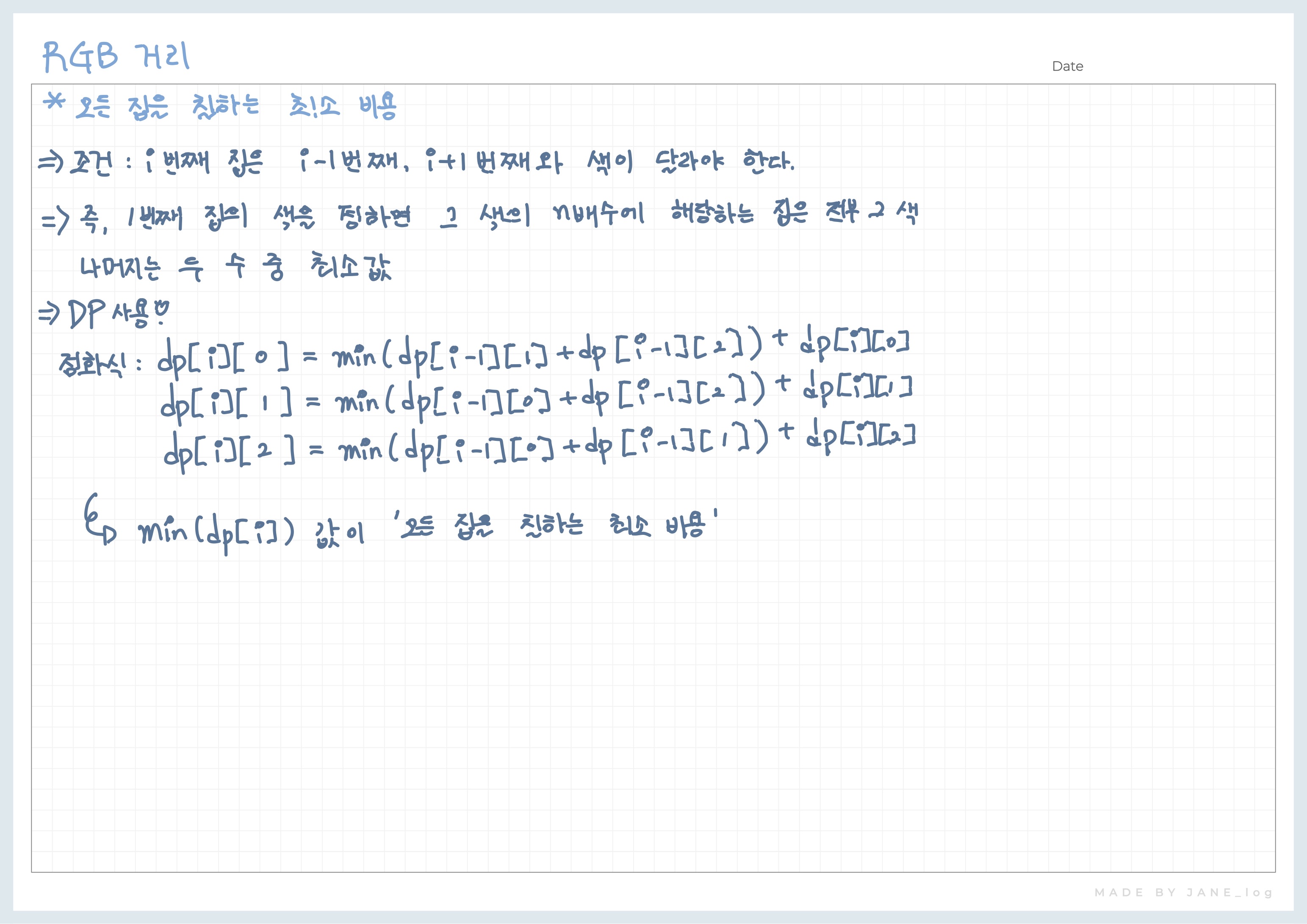 집은 빨강, 초록, 파랑 중 하나의 색으로 칠해야 한다. 각각의 집을 빨강, 초록, 파랑으로 칠하는 비용이 주어졌을 때, 아래 규칙을 만족하면서 모든 집을 칠하는 비용의 최솟값을 구해보자.