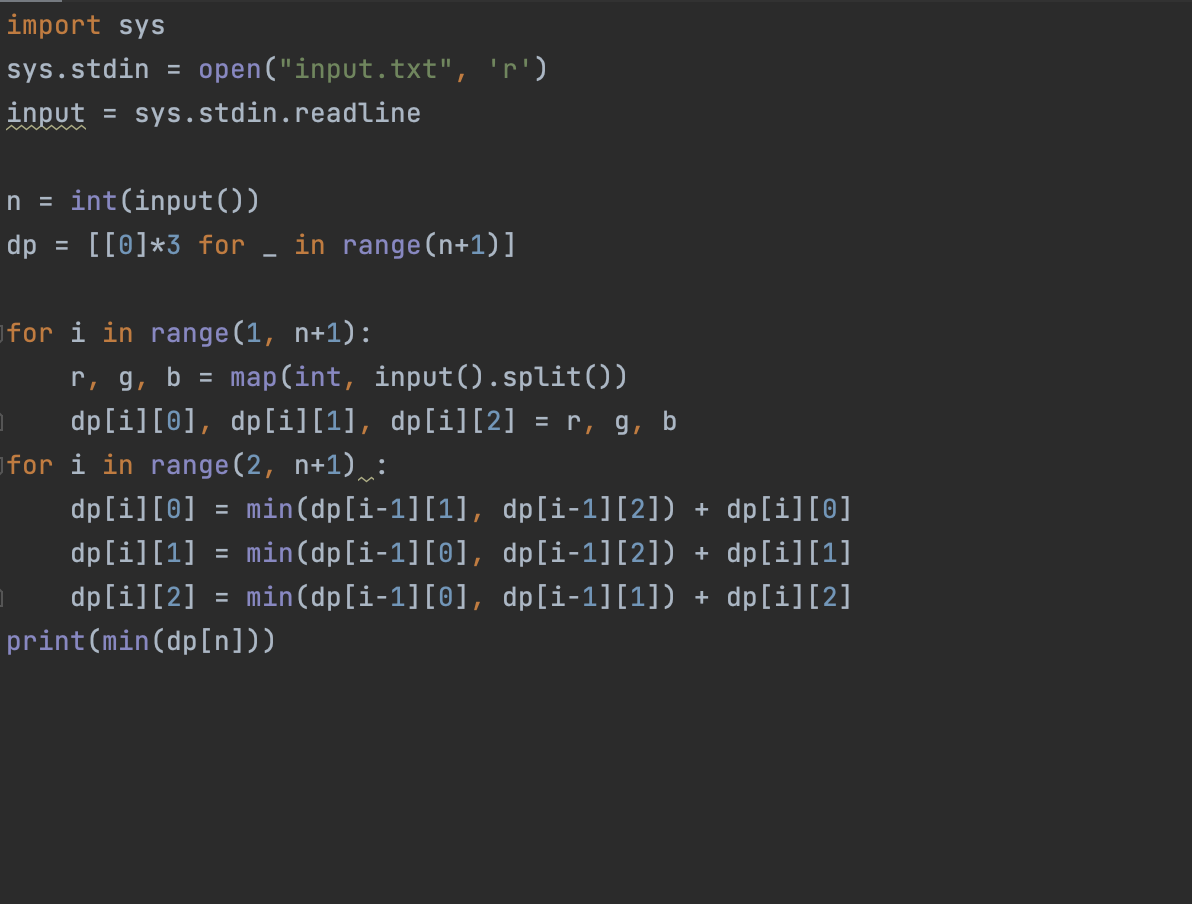 첫째 줄에 집의 수 N(2 ≤ N ≤ 1,000)이 주어진다. 둘째 줄부터 N개의 줄에는 각 집을 빨강, 초록, 파랑으로 칠하는 비용이 1번 집부터 한 줄에 하나씩 주어진다. 집을 칠하는 비용은 1,000보다 작거나 같은 자연수이다.