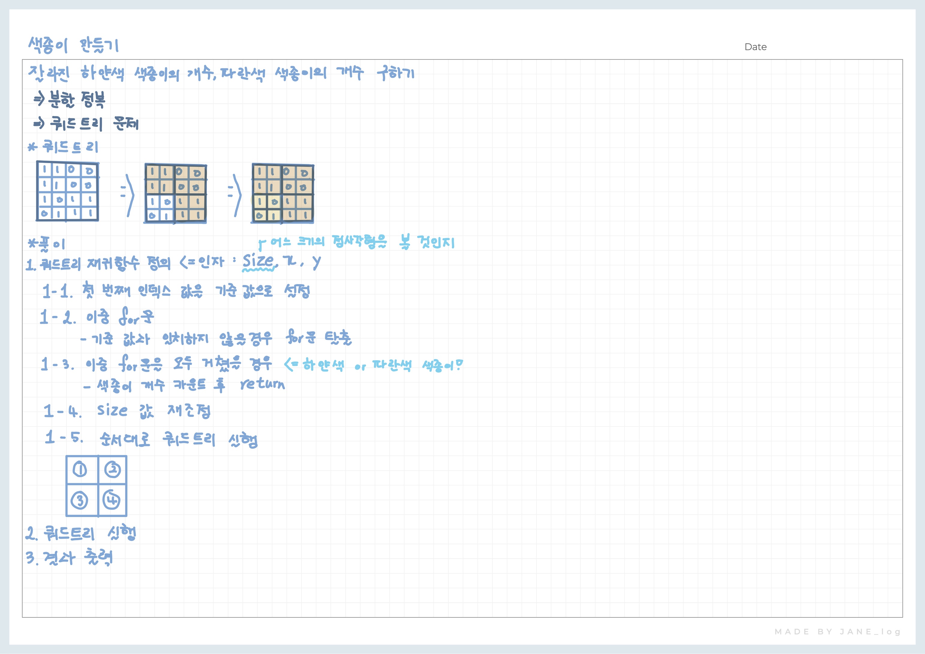 전체 종이가 모두 같은 색으로 칠해져 있지 않으면 가로와 세로로 중간 부분을 잘라서 <그림 2>의 I, II, III, IV와 같이 똑같은 크기의 네 개의 N/2 × N/2색종이로 나눈다. 나누어진 종이 I, II, III, IV 각각에 대해서도 앞에서와 마찬가지로 모두 같은 색으로 칠해져 있지 않으면 같은 방법으로 똑같은 크기의 네 개의 색종이로 나눈다. 이와 같은 과정을 잘라진 종이가 모두 하얀색 또는 모두 파란색으로 칠해져 있거나, 하나의 정사각형 칸이 되어 더 이상 자를 수 없을 때까지 반복한다.