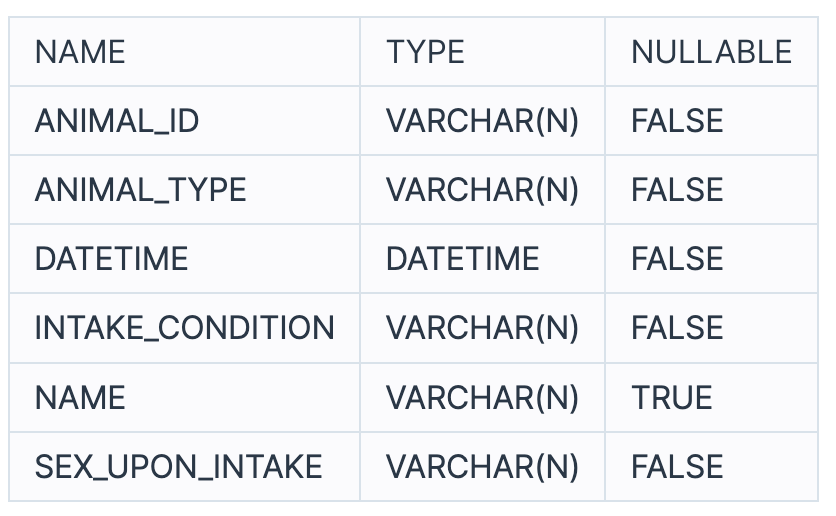 ANIMAL_INS 테이블은 동물 보호소에 들어온 동물의 정보를 담은 테이블입니다. ANIMAL_INS 테이블 구조는 다음과 같으며, ANIMAL_ID, ANIMAL_TYPE, DATETIME, INTAKE_CONDITION, NAME, SEX_UPON_INTAKE는 각각 동물의 아이디, 생물 종, 보호 시작일, 보호 시작 시 상태, 이름, 성별 및 중성화 여부를 나타냅니다.