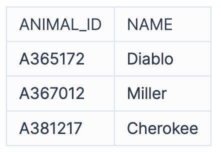 이 중 젊은 동물은 Diablo, Miller, Cherokee입니다. 따라서 SQL문을 실행하면 다음과 같이 나와야 합니다.