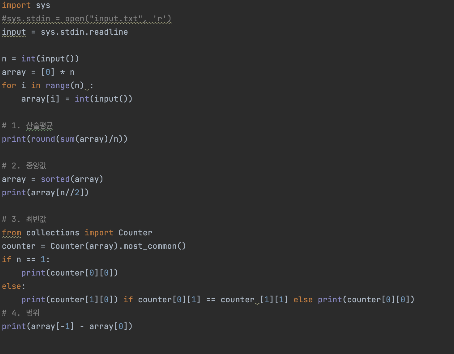 첫째 줄에 수의 개수 N(1 ≤ N ≤ 500,000)이 주어진다. 단, N은 홀수이다. 그 다음 N개의 줄에는 정수들이 주어진다. 입력되는 정수의 절댓값은 4,000을 넘지 않는다.