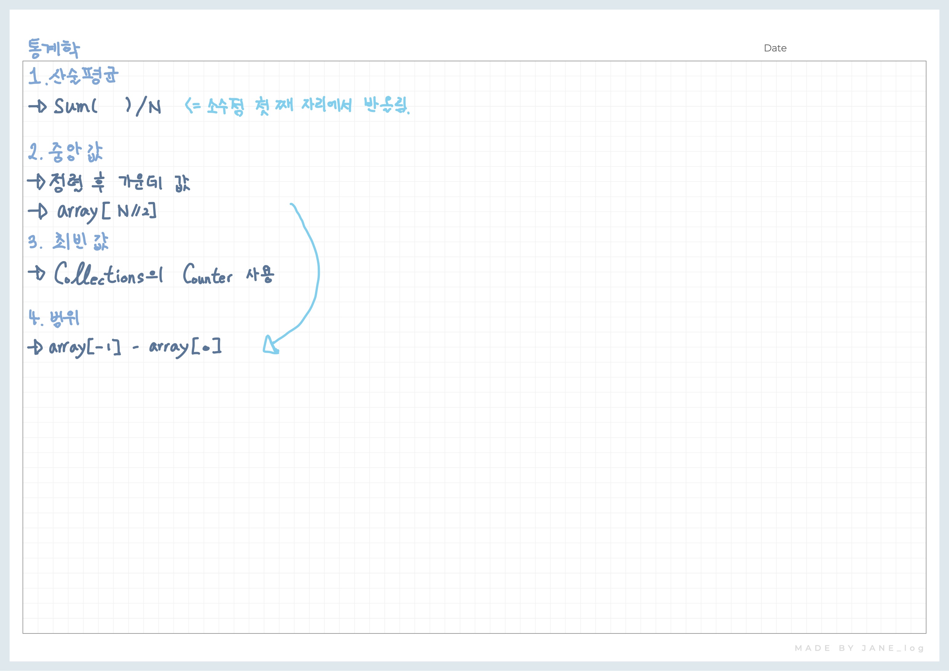 수를 처리하는 것은 통계학에서 상당히 중요한 일이다. 통계학에서 N개의 수를 대표하는 기본 통계값에는 다음과 같은 것들이 있다. 단, N은 홀수라고 가정하자.