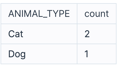 고양이는 2마리, 개는 1마리 들어왔습니다. 따라서 SQL문을 실행하면 다음과 같이 나와야 합니다.