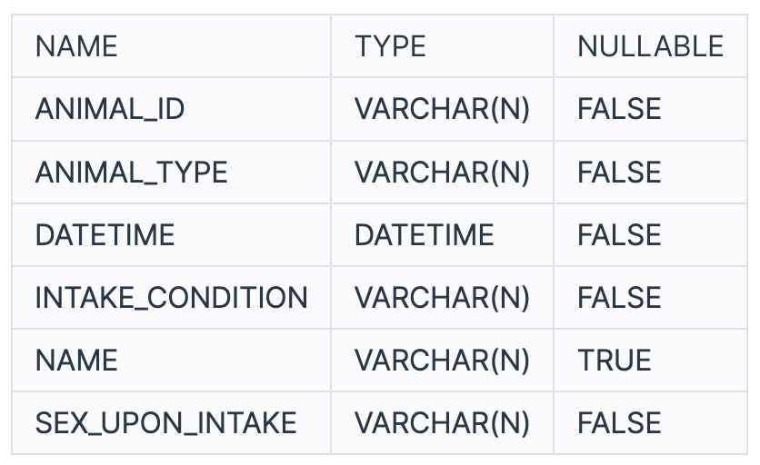 ANIMAL_INS 테이블은 동물 보호소에 들어온 동물의 정보를 담은 테이블입니다. ANIMAL_INS 테이블 구조는 다음과 같으며, ANIMAL_ID, ANIMAL_TYPE, DATETIME, INTAKE_CONDITION, NAME, SEX_UPON_INTAKE는 각각 동물의 아이디, 생물 종, 보호 시작일, 보호 시작 시 상태, 이름, 성별 및 중성화 여부를 나타냅니다.