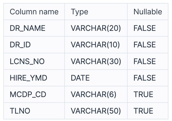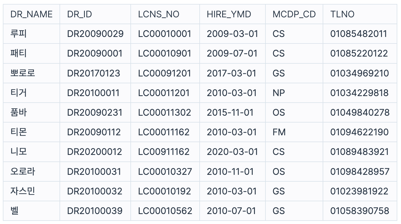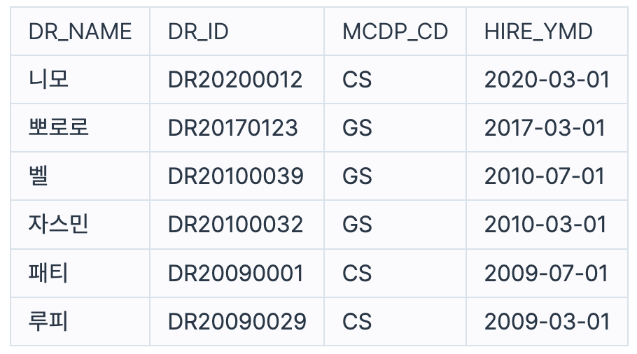 다음은 종합병원에 속한 의사 정보를 담은DOCTOR 테이블입니다. DOCTOR 테이블은 다음과 같으며 DR_NAME, DR_ID, LCNS_NO, HIRE_YMD, MCDP_CD, TLNO는 각각 의사이름, 의사ID, 면허번호, 고용일자, 진료과코드, 전화번호를 나타냅니다.
