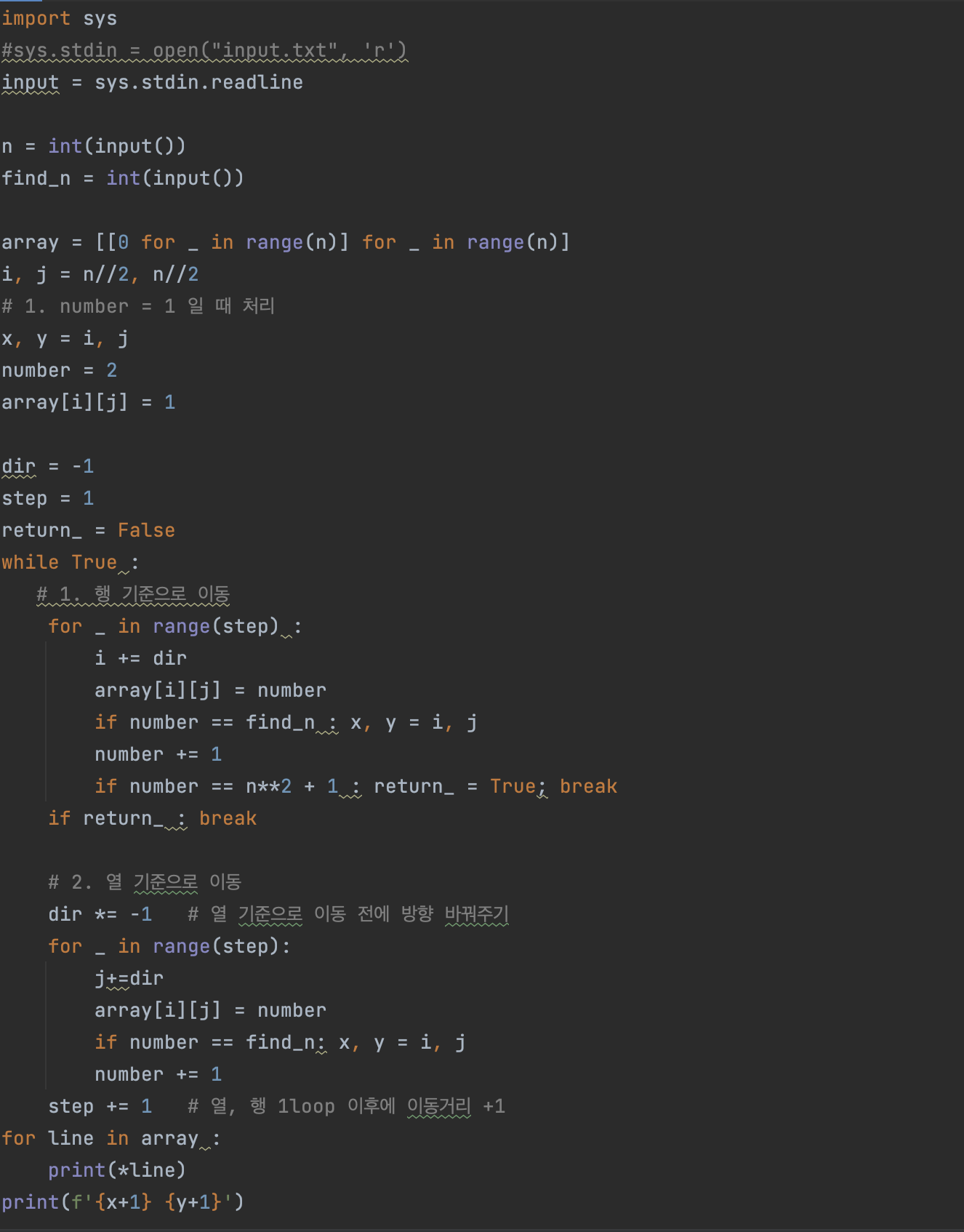 첫째 줄에 홀수인 자연수 N(3 ≤ N ≤ 999)이 주어진다. 둘째 줄에는 위치를 찾고자 하는 N2 이하의 자연수가 하나 주어진다.