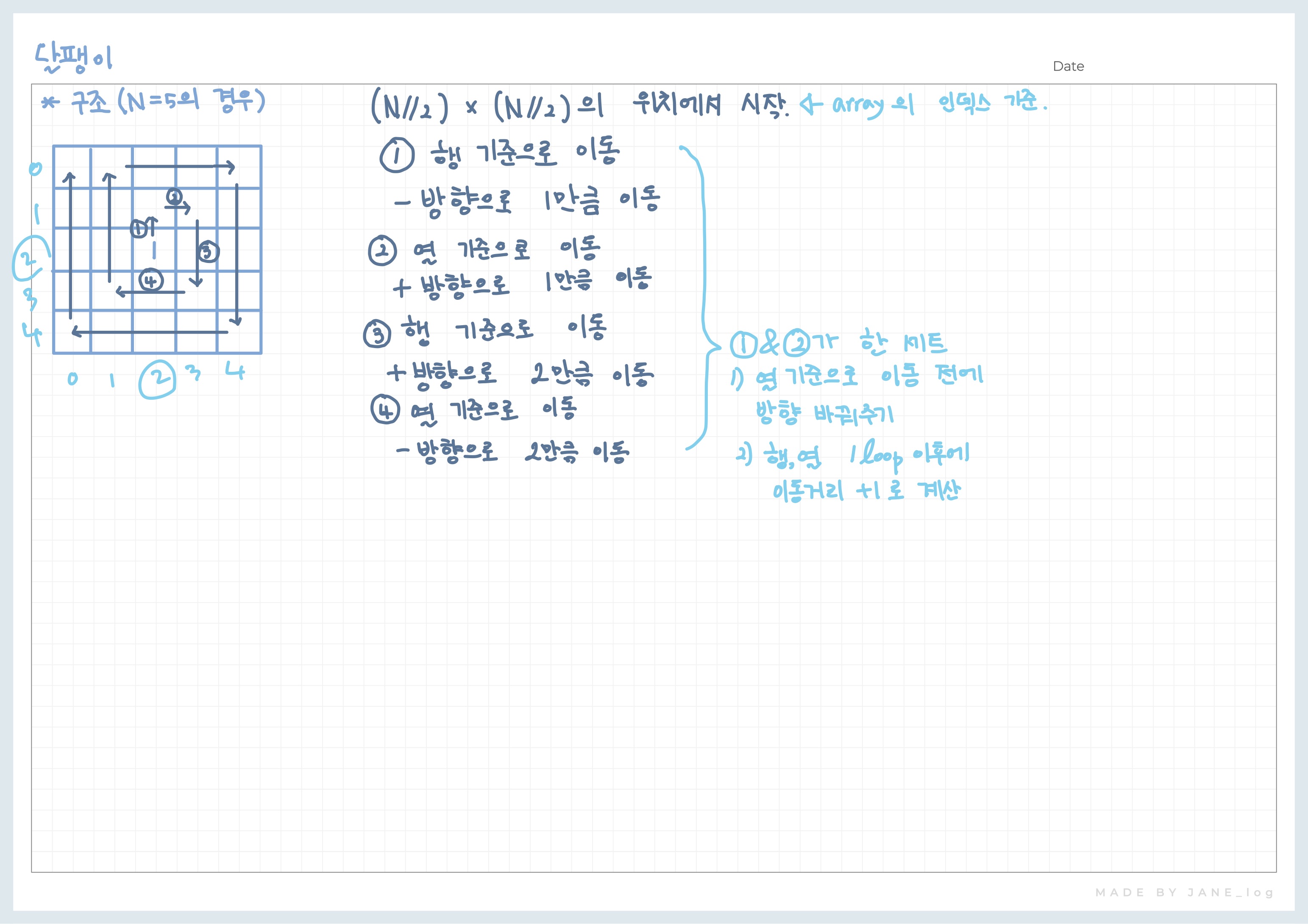 홀수인 자연수 N이 주어지면, 다음과 같이 1부터 N2까지의 자연수를 달팽이 모양으로 N×N의 표에 채울 수 있다.
