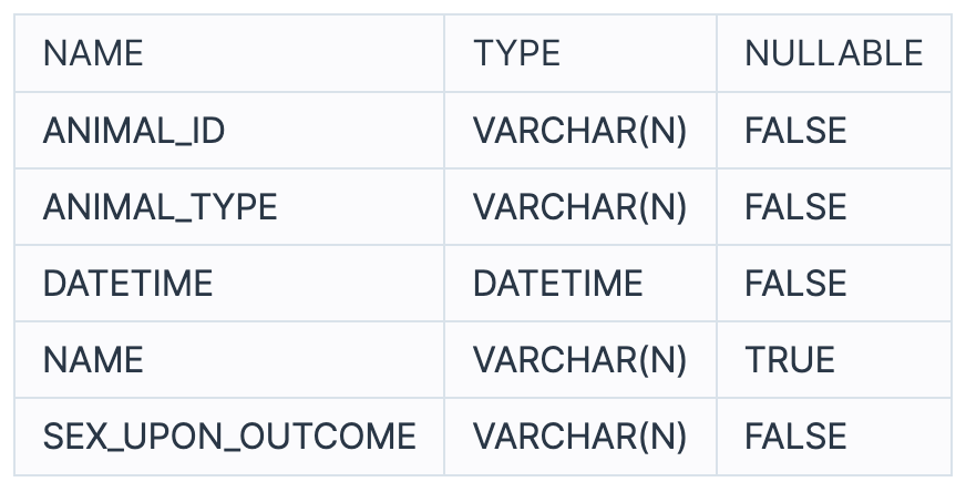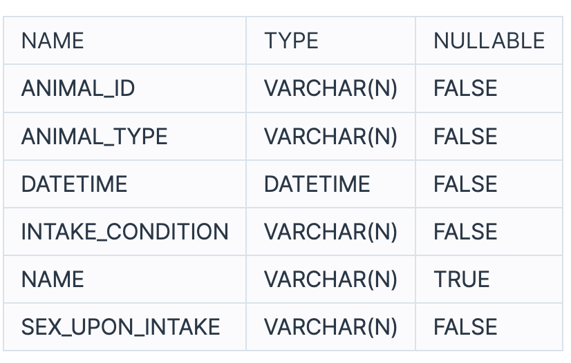 ANIMAL_INS 테이블은 동물 보호소에 들어온 동물의 정보를 담은 테이블입니다. ANIMAL_INS 테이블 구조는 다음과 같으며, ANIMAL_ID, ANIMAL_TYPE, DATETIME, INTAKE_CONDITION, NAME, SEX_UPON_INTAKE는 각각 동물의 아이디, 생물 종, 보호 시작일, 보호 시작 시 상태, 이름, 성별 및 중성화 여부를 나타냅니다.