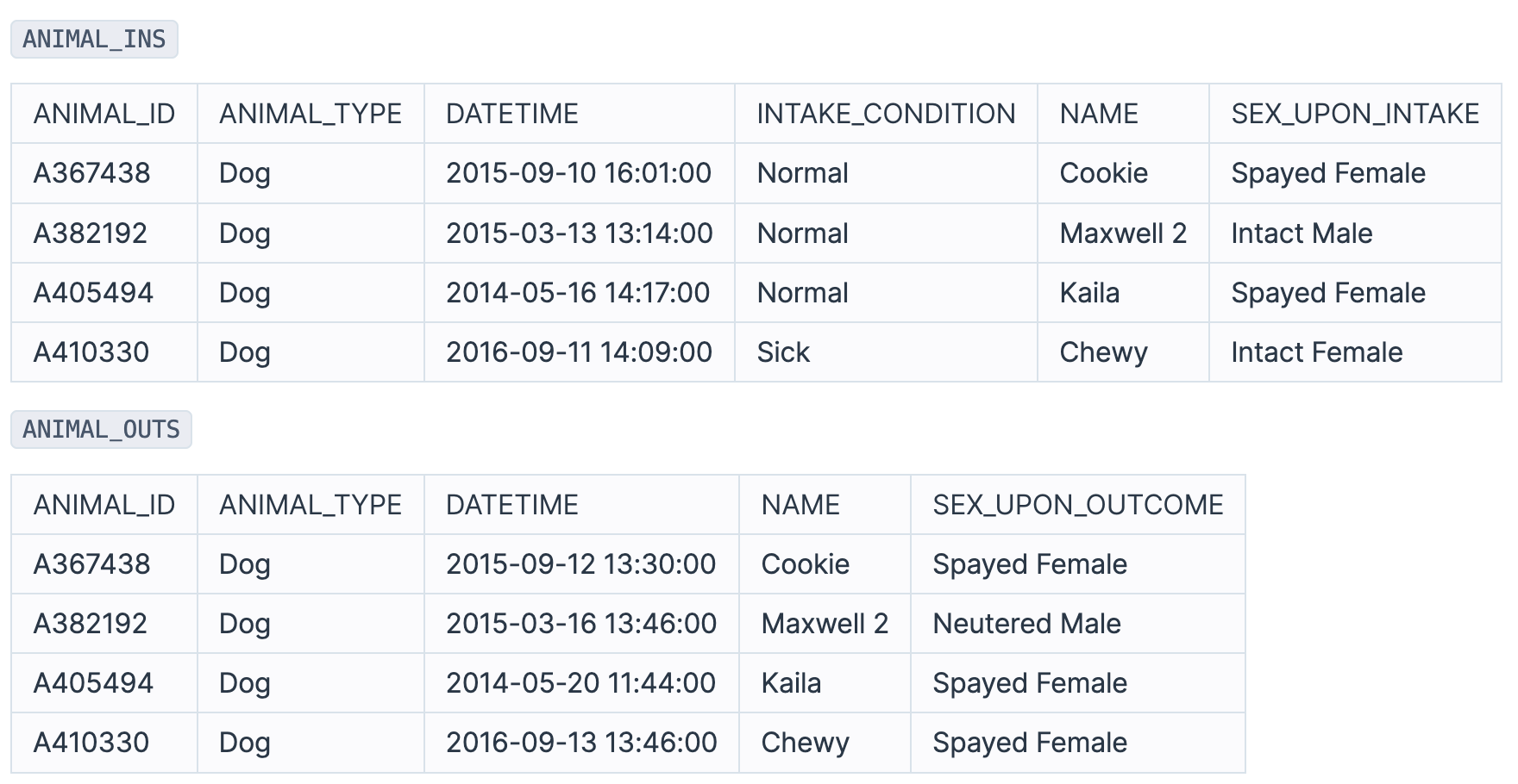 예를 들어, ANIMAL_INS 테이블과 ANIMAL_OUTS 테이블이 다음과 같다면