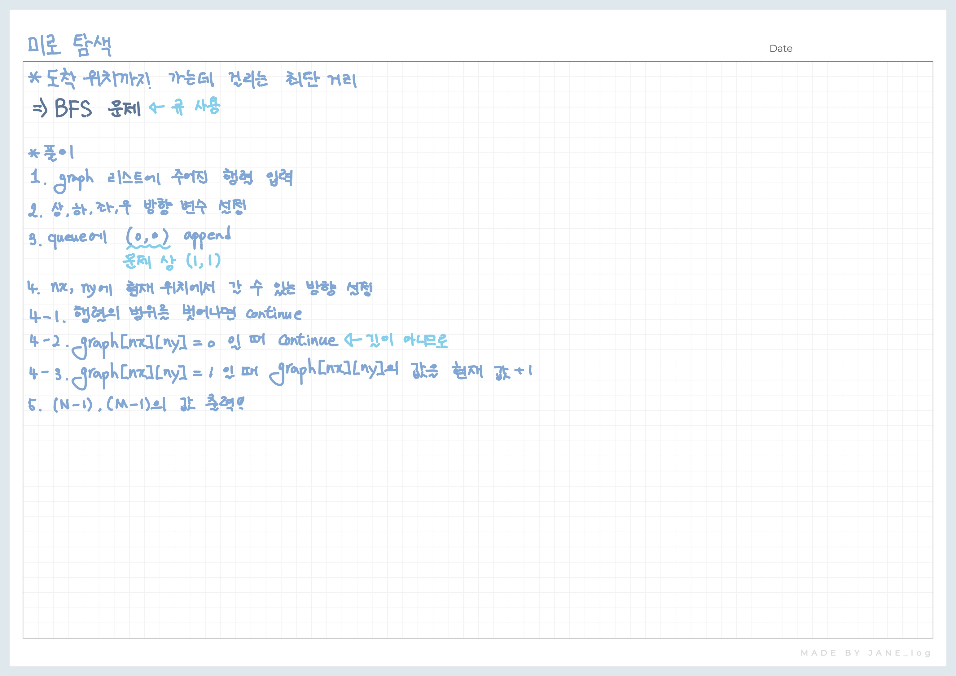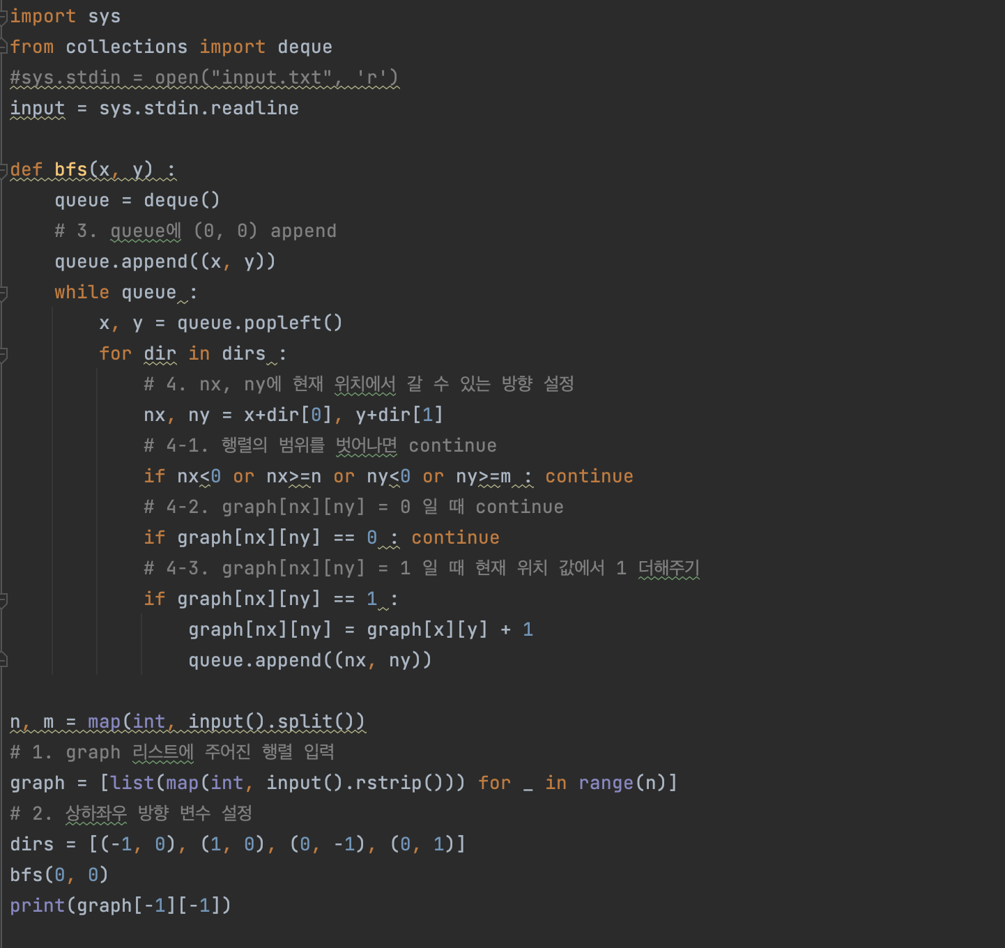 미로에서 1은 이동할 수 있는 칸을 나타내고, 0은 이동할 수 없는 칸을 나타낸다. 이러한 미로가 주어졌을 때, (1, 1)에서 출발하여 (N, M)의 위치로 이동할 때 지나야 하는 최소의 칸 수를 구하는 프로그램을 작성하시오. 한 칸에서 다른 칸으로 이동할 때, 서로 인접한 칸으로만 이동할 수 있다.