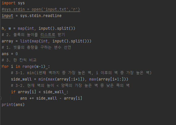 두 번째 줄에는 블록이 쌓인 높이를 의미하는 0이상 H이하의 정수가 2차원 세계의 맨 왼쪽 위치부터 차례대로 W개 주어진다.
