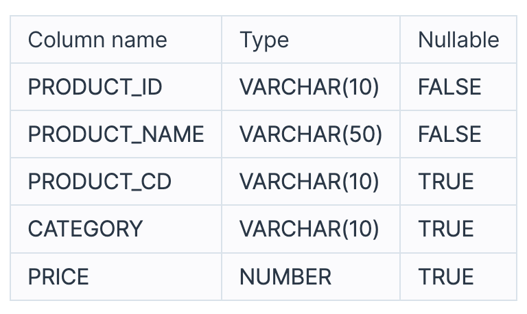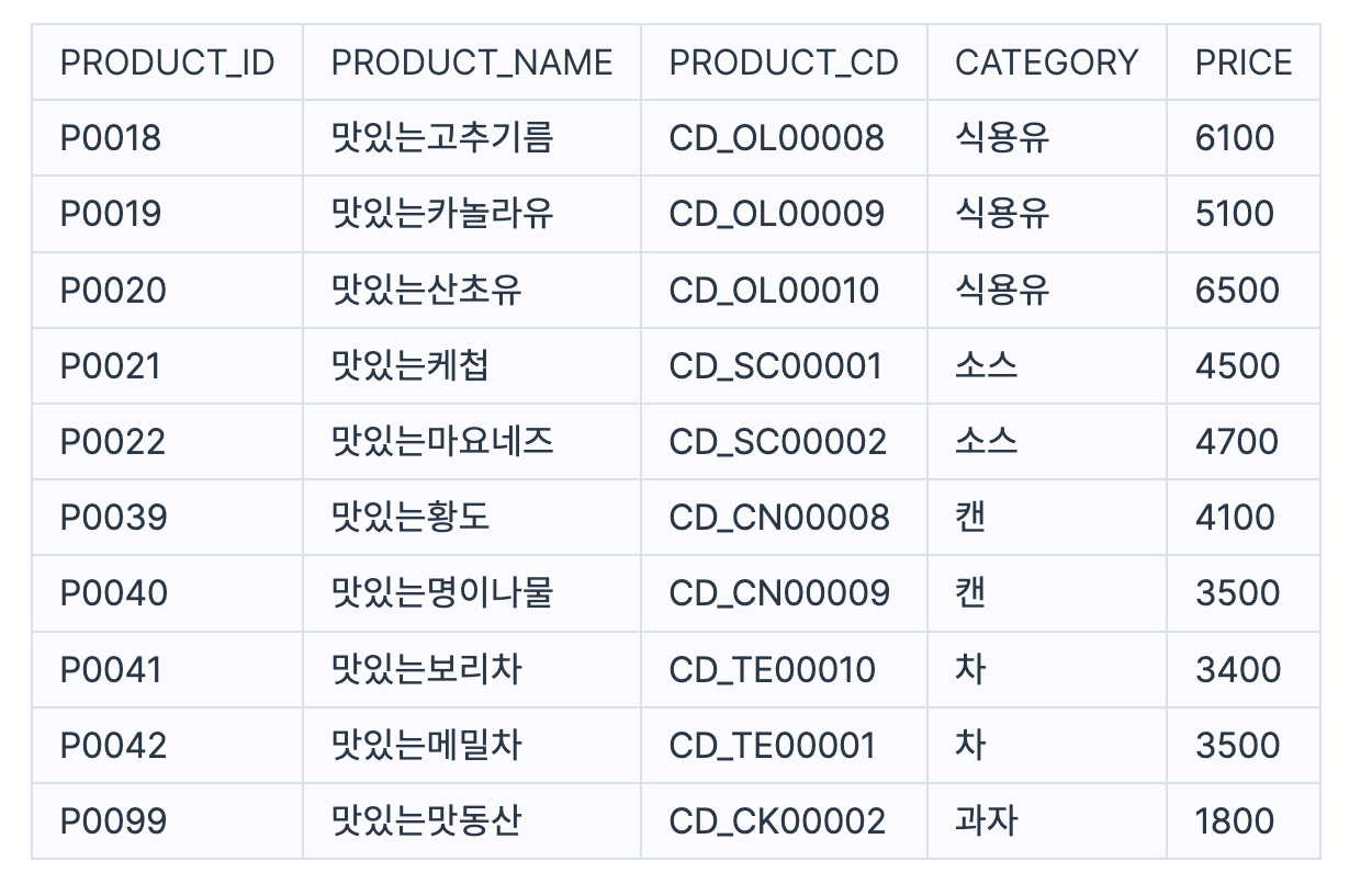 다음은 식품의 정보를 담은 FOOD_PRODUCT 테이블입니다. FOOD_PRODUCT 테이블은 다음과 같으며 PRODUCT_ID, PRODUCT_NAME, PRODUCT_CD, CATEGORY, PRICE는 식품 ID, 식품 이름, 식품코드, 식품분류, 식품 가격을 의미합니다.