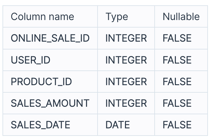 다음은 어느 의류 쇼핑몰의 온라인 상품 판매 정보를 담은 ONLINE_SALE 테이블 입니다. ONLINE_SALE 테이블은 아래와 같은 구조로 되어있으며 ONLINE_SALE_ID, USER_ID, PRODUCT_ID, SALES_AMOUNT, SALES_DATE는 각각 온라인 상품 판매 ID, 회원 ID, 상품 ID, 판매량, 판매일을 나타냅니다.