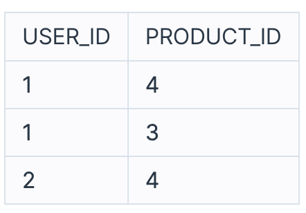 USER_ID 가 1인 유저가 PRODUCT_ID 가 3, 4인 상품들을 재구매하고, USER_ID 가 2인 유저가 PRODUCT_ID 가 4인 상품을 재구매 하였으므로, 다음과 같이 결과가 나와야합니다.