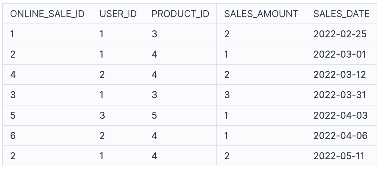 예를 들어 ONLINE_SALE 테이블이 다음과 같다면