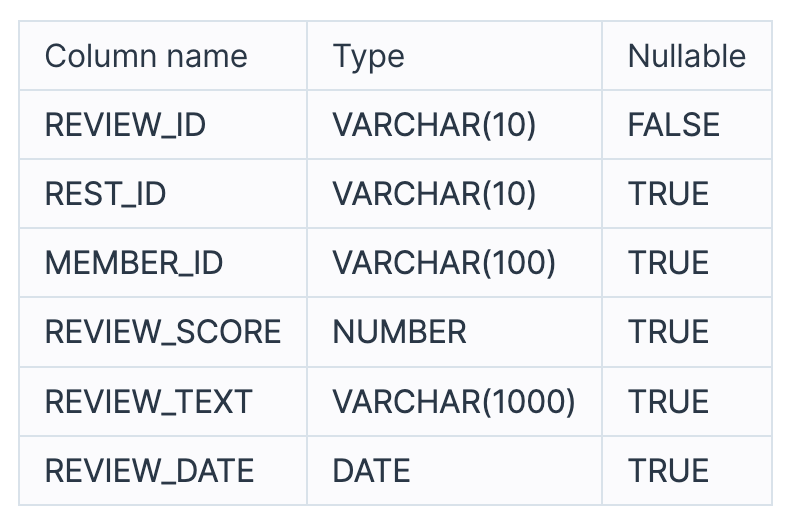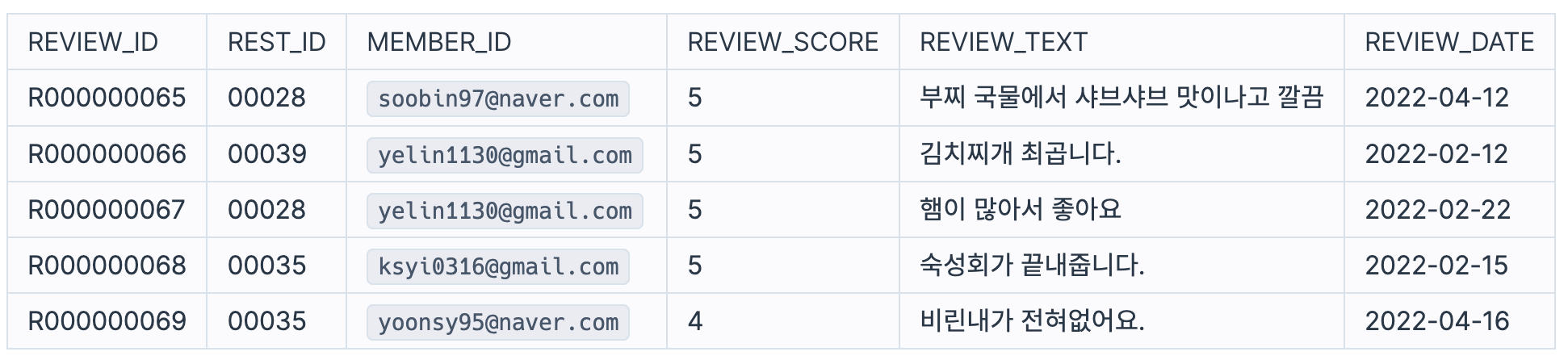REST_REVIEW 테이블은 다음과 같으며 REVIEW_ID, REST_ID, MEMBER_ID, REVIEW_SCORE, REVIEW_TEXT,REVIEW_DATE는 각각 리뷰 ID, 식당 ID, 회원 ID, 점수, 리뷰 텍스트, 리뷰 작성일을 의미합니다.