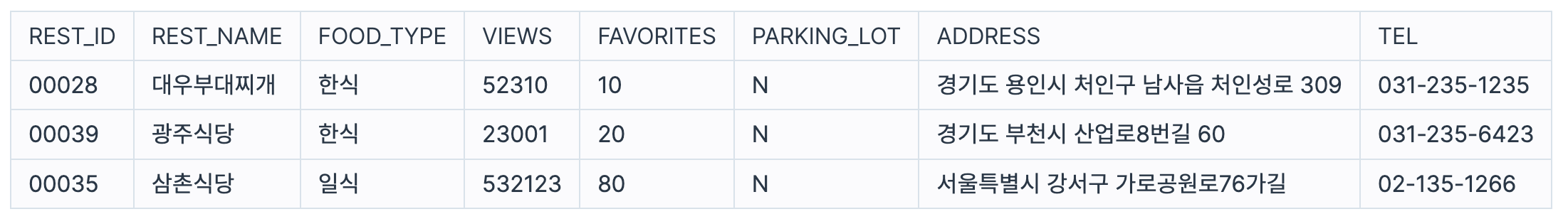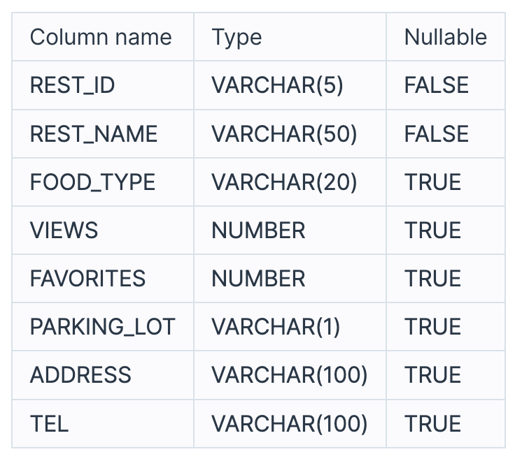 다음은 식당의 정보를 담은 REST_INFO 테이블과 식당의 리뷰 정보를 담은 REST_REVIEW 테이블입니다. REST_INFO 테이블은 다음과 같으며 REST_ID, REST_NAME, FOOD_TYPE, VIEWS, FAVORITES, PARKING_LOT, ADDRESS, TEL은 식당 ID, 식당 이름, 음식 종류, 조회수, 즐겨찾기수, 주차장 유무, 주소, 전화번호를 의미합니다.
