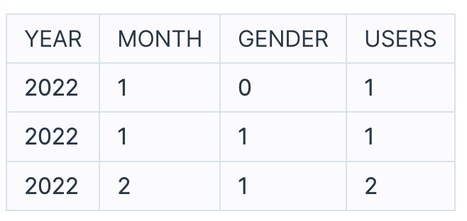 SELECT YEAR(SALE.SALES_DATE) AS YEAR, MONTH(SALE.SALES_DATE) AS MONTH, INFO.GENDER, COUNT(DISTINCT SALE.USER_ID) AS USERS