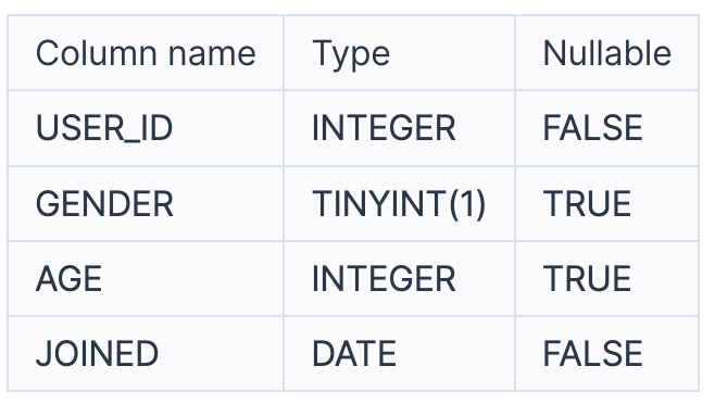다음은 어느 의류 쇼핑몰에 가입한 회원 정보를 담은 USER_INFO 테이블과 온라인 상품 판매 정보를 담은 ONLINE_SALE 테이블 입니다.USER_INFO 테이블은 아래와 같은 구조로 되어있으며 USER_ID, GENDER, AGE, JOINED는 각각 회원 ID, 성별, 나이, 가입일을 나타냅니다.
