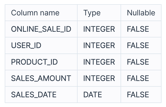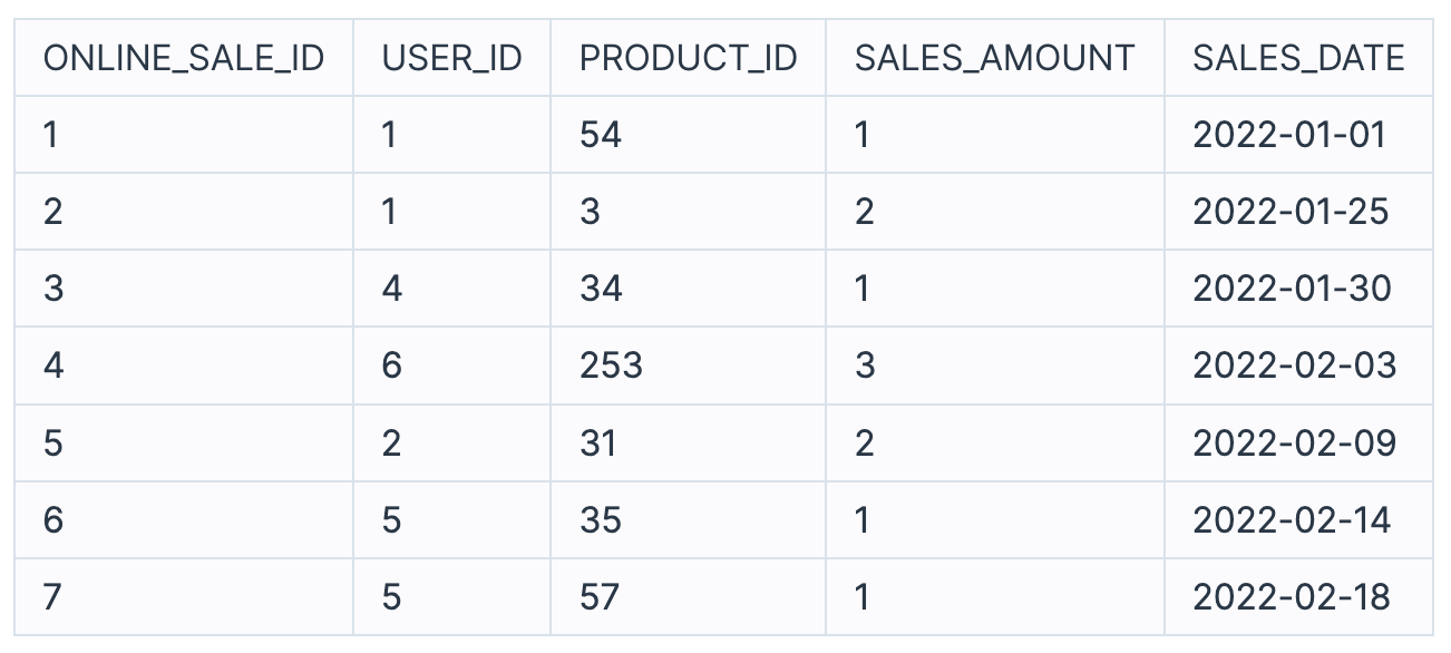 ONLINE_SALE_ID, USER_ID, PRODUCT_ID, SALES_AMOUNT, SALES_DATE는 각각 온라인 상품 판매 ID, 회원 ID, 상품 ID, 판매량, 판매일을 나타냅니다.