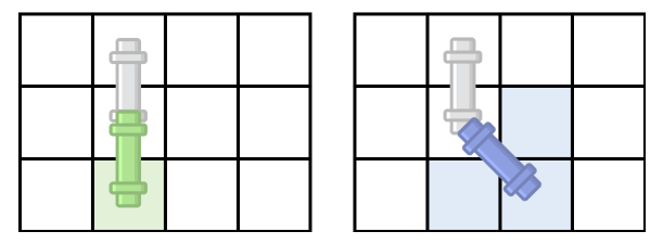 파이프는 매우 무겁기 때문에, 유현이는 파이프를 밀어서 이동시키려고 한다. 벽에는 새로운 벽지를 발랐기 때문에, 파이프가 벽을 긁으면 안 된다. 즉, 파이프는 항상 빈 칸만 차지해야 한다.