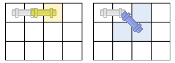 오늘은 집 수리를 위해서 파이프 하나를 옮기려고 한다. 파이프는 아래와 같은 형태이고, 2개의 연속된 칸을 차지하는 크기이다.