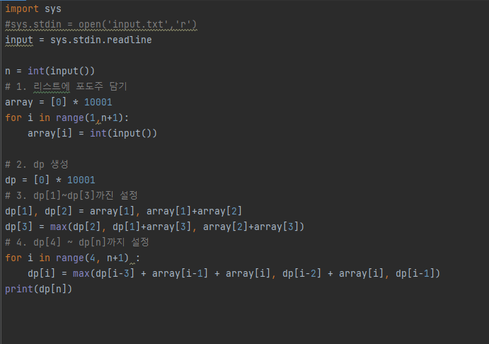 효주는 될 수 있는 대로 많은 양의 포도주를 맛보기 위해서 어떤 포도주 잔을 선택해야 할지 고민하고 있다. 1부터 n까지의 번호가 붙어 있는 n개의 포도주 잔이 순서대로 테이블 위에 놓여 있고, 각 포도주 잔에 들어있는 포도주의 양이 주어졌을 때, 효주를 도와 가장 많은 양의 포도주를 마실 수 있도록 하는 프로그램을 작성하시오.