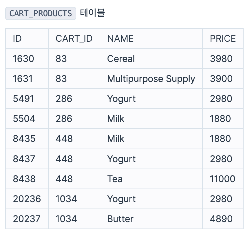 예를 들어 CART_PRODUCTS 테이블이 다음과 같다면