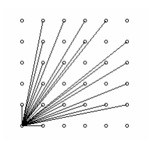 (0,0)에서 (x,y)가 보이려면 (0,0)과 (x,y)를 연결하는 직선이 다른 점을 통과하지 않아야 한다. 예를 들어 (4,2)는 (0,0)에서 보이지 않는다. 그 이유는 (0,0)과 (4,2)를 연결하는 직선이 (2,1)을 통과하기 때문이다. 아래 그림은 0 <= x,y<=5인 경우에 (0,0)에서 보이는 점의 개수이다. 단, (0,0)은 계산하지 않는다.