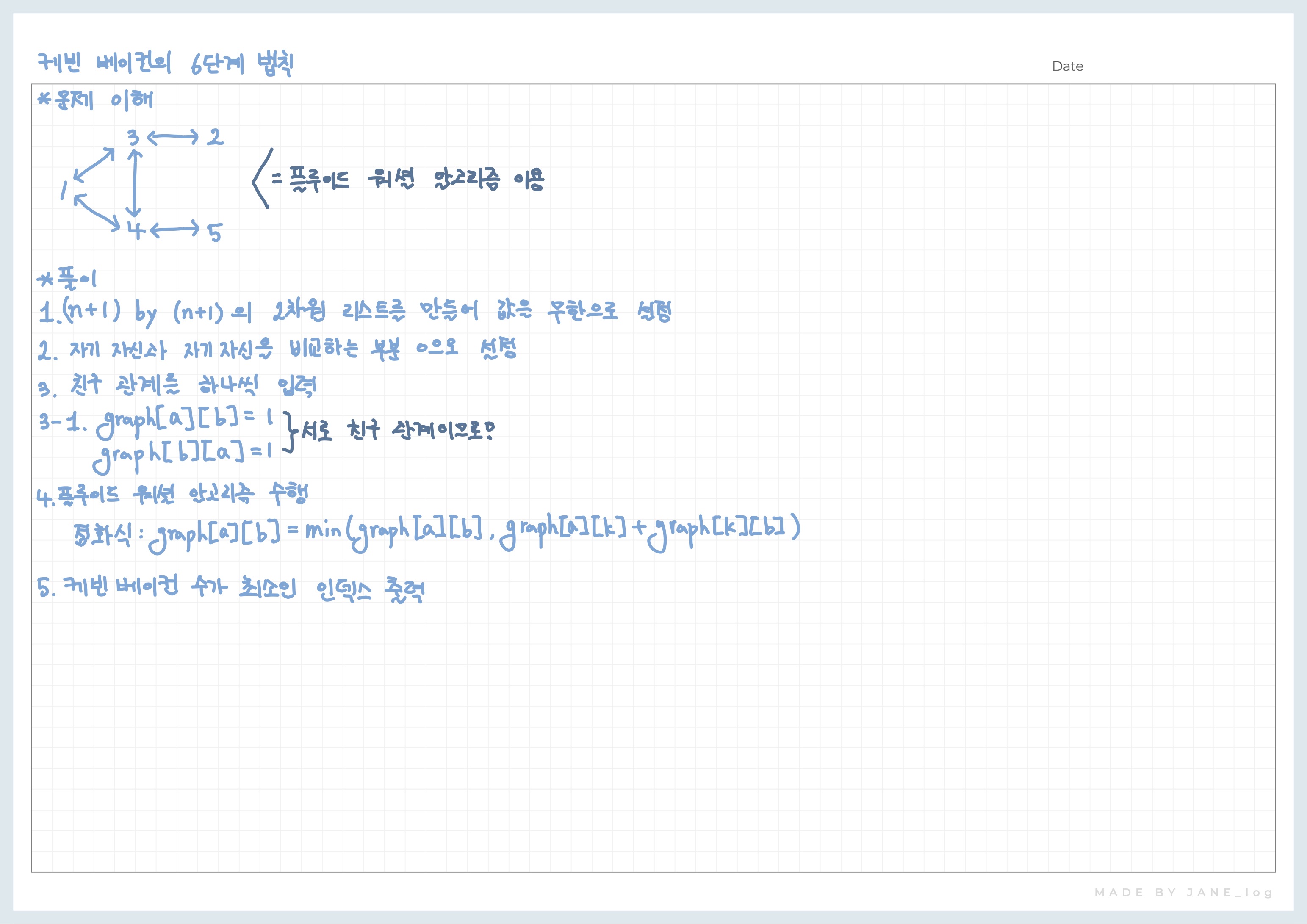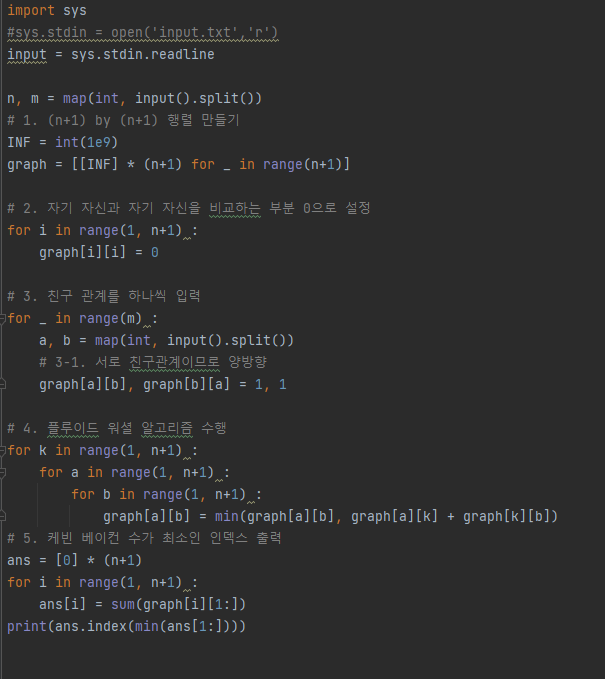 BOJ 유저의 수와 친구 관계가 입력으로 주어졌을 때, 케빈 베이컨의 수가 가장 작은 사람을 구하는 프로그램을 작성하시오.