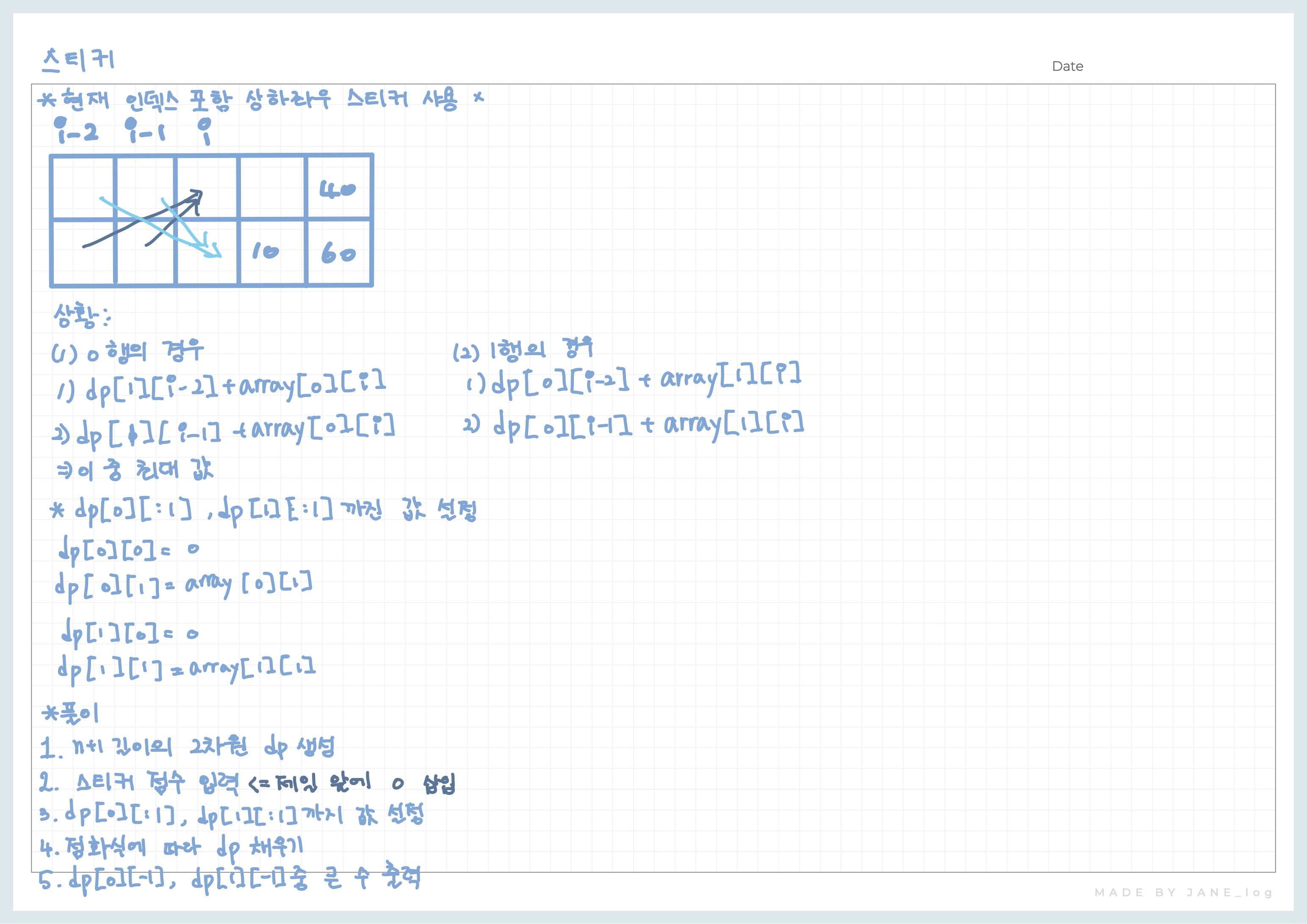 모든 스티커를 붙일 수 없게된 상냥이는 각 스티커에 점수를 매기고, 점수의 합이 최대가 되게 스티커를 떼어내려고 한다. 먼저, 그림 (b)와 같이 각 스티커에 점수를 매겼다. 상냥이가 뗄 수 있는 스티커의 점수의 최댓값을 구하는 프로그램을 작성하시오. 즉, 2n개의 스티커 중에서 점수의 합이 최대가 되면서 서로 변을 공유 하지 않는 스티커 집합을 구해야 한다.