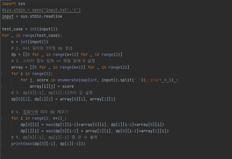 첫째 줄에 테스트 케이스의 개수 T가 주어진다. 각 테스트 케이스의 첫째 줄에는 n (1 ≤ n ≤ 100,000)이 주어진다. 다음 두 줄에는 n개의 정수가 주어지며, 각 정수는 그 위치에 해당하는 스티커의