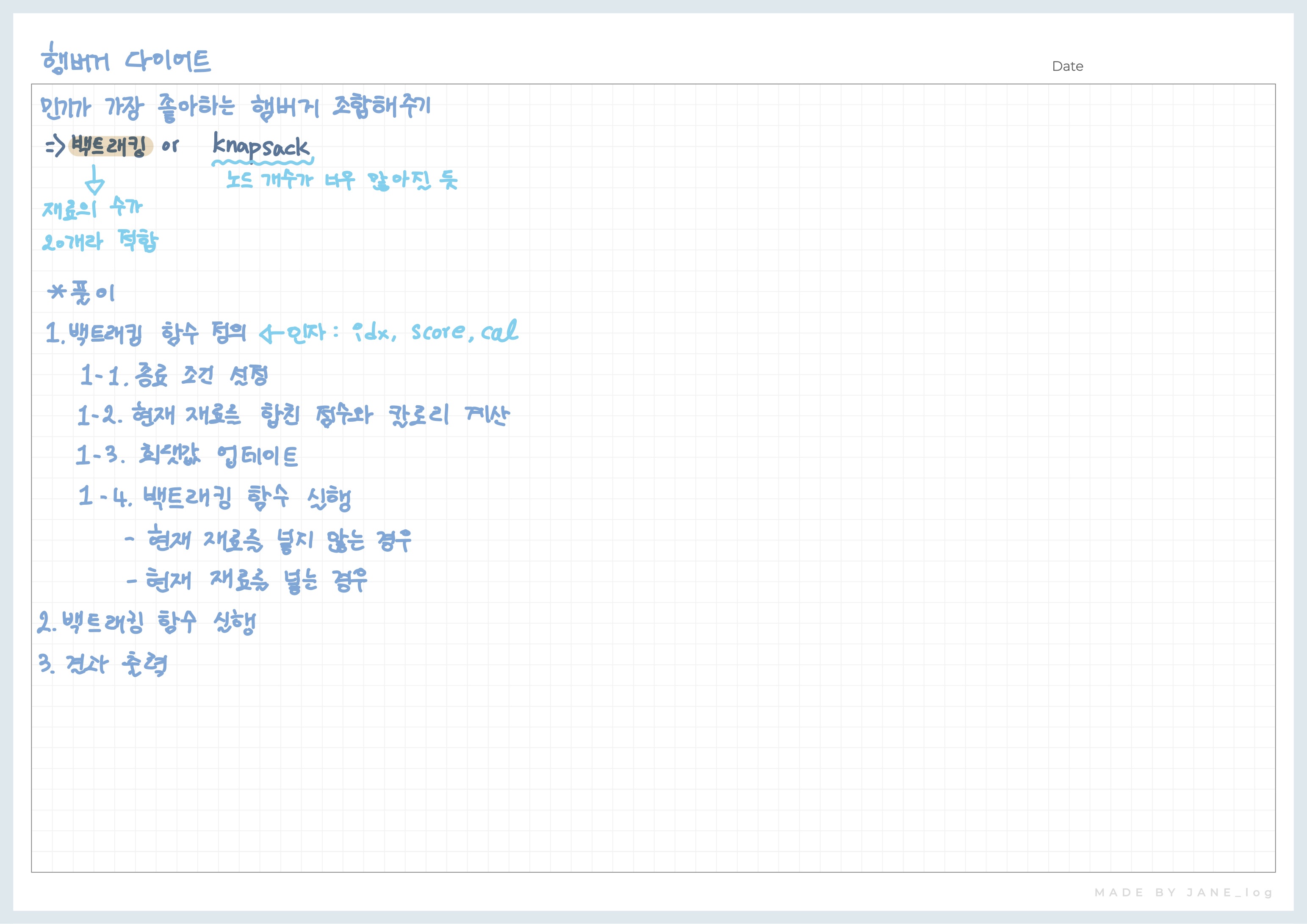 그렇다고 햄버거를 포기할 수 없었던 민기는 햄버거의 맛은 최대한 유지하면서 정해진 칼로리를 넘지 않는 햄버거를 주문하여 먹으려고 한다.
