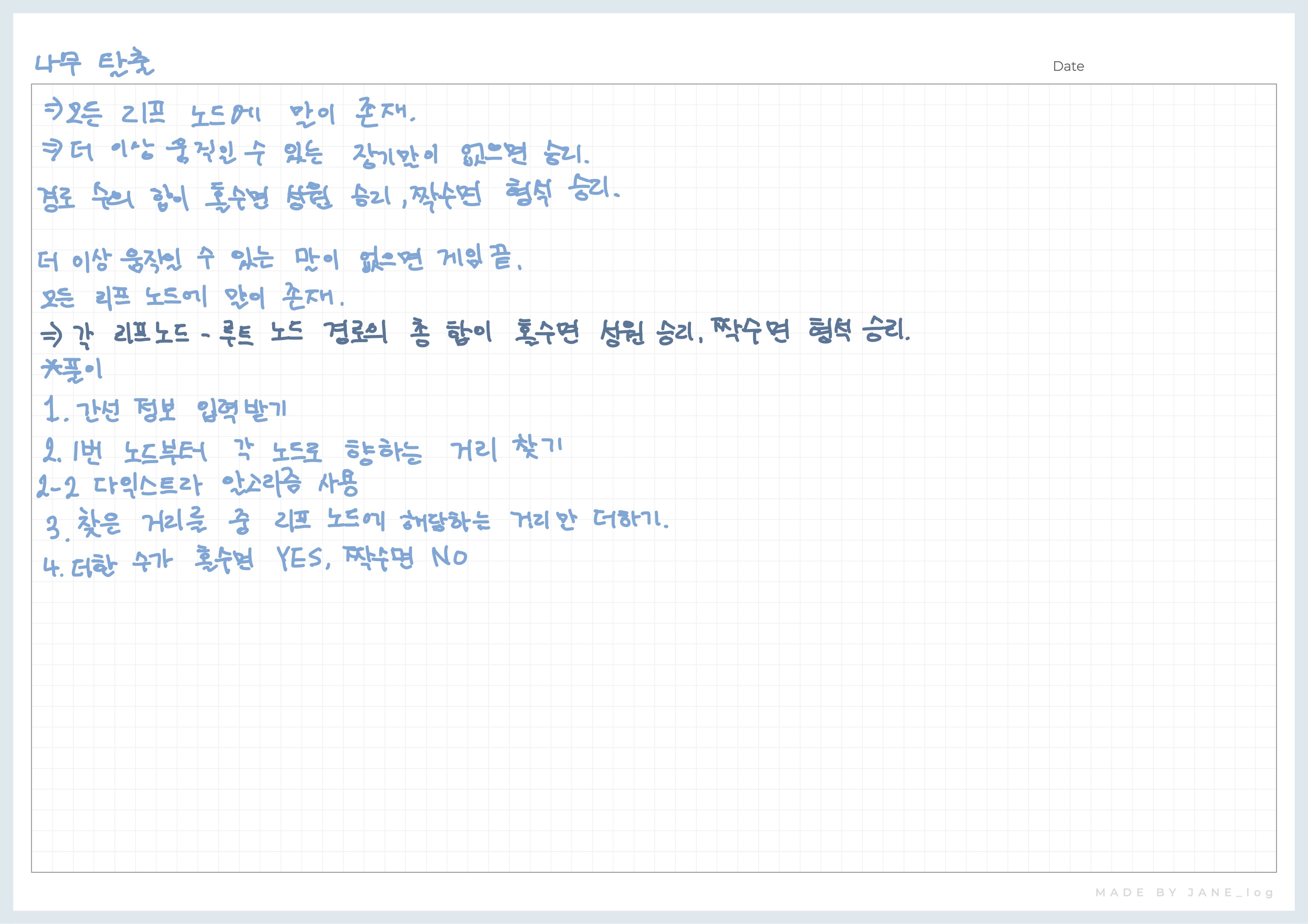 이 게임은 두 사람이 번갈아 가면서 게임판에 놓여있는 게임말을 움직이는 게임이다. 처음에는 트리의 모든 리프 노드에 게임말이 하나씩 놓여있는 채로 시작한다. 어떤 사람의 차례가 오면, 그 사람은 현재 존재하는 게임말 중 아무거나 하나를 골라 그 말이 놓여있던 노드의 부모 노드로 옮긴다. 이 과정에서 한 노드에 여러 개의 게임말이 놓이게 될 수도 있다. 이렇게 옮긴 후에 만약 그 게임말이 루트 노드에 도착했다면 그 게임말을 즉시 제거한다. 모든 과정을 마치면 다음 사람에게 차례를 넘긴다. 이런 식으로 계속 진행하다가 게임말이 게임판에 존재하지 않아 고를 수 없는 사람이 지게 된다.