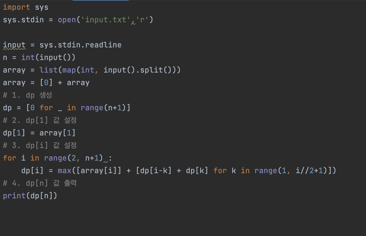 첫째 줄에 민규가 구매하려고 하는 카드의 개수 N이 주어진다. (1 ≤ N ≤ 1,000) 둘째 줄에는 Pi가 P1부터 PN까지 순서대로 주어진다. (1 ≤ Pi ≤ 10,000)