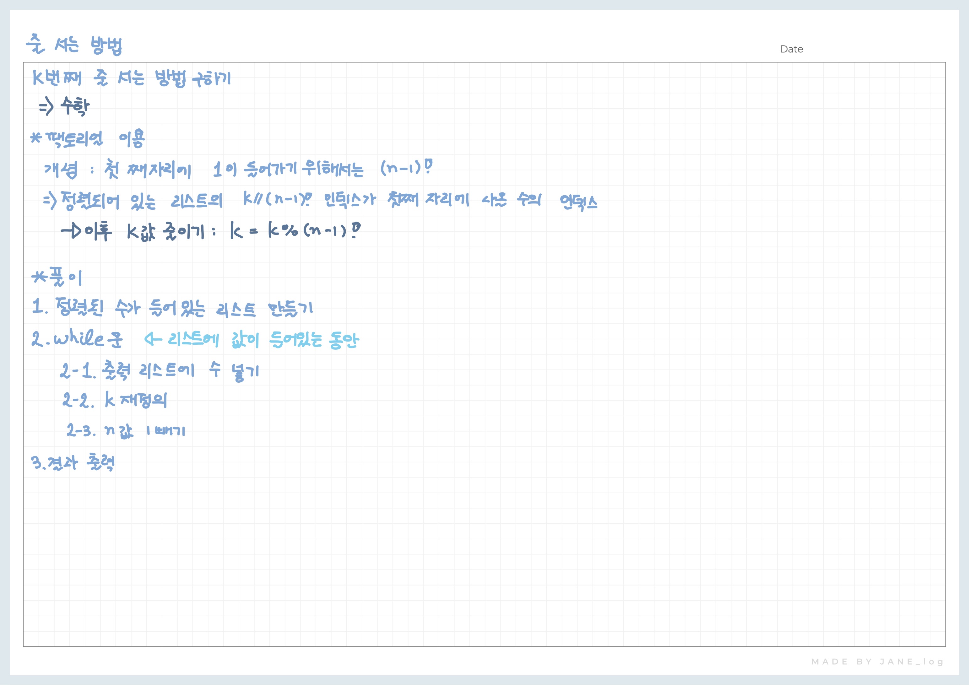사람의 수 n과, 자연수 k가 주어질 때, 사람을 나열 하는 방법을 사전 순으로 나열 했을 때, k번째 방법을 return하는 solution 함수를 완성해주세요.