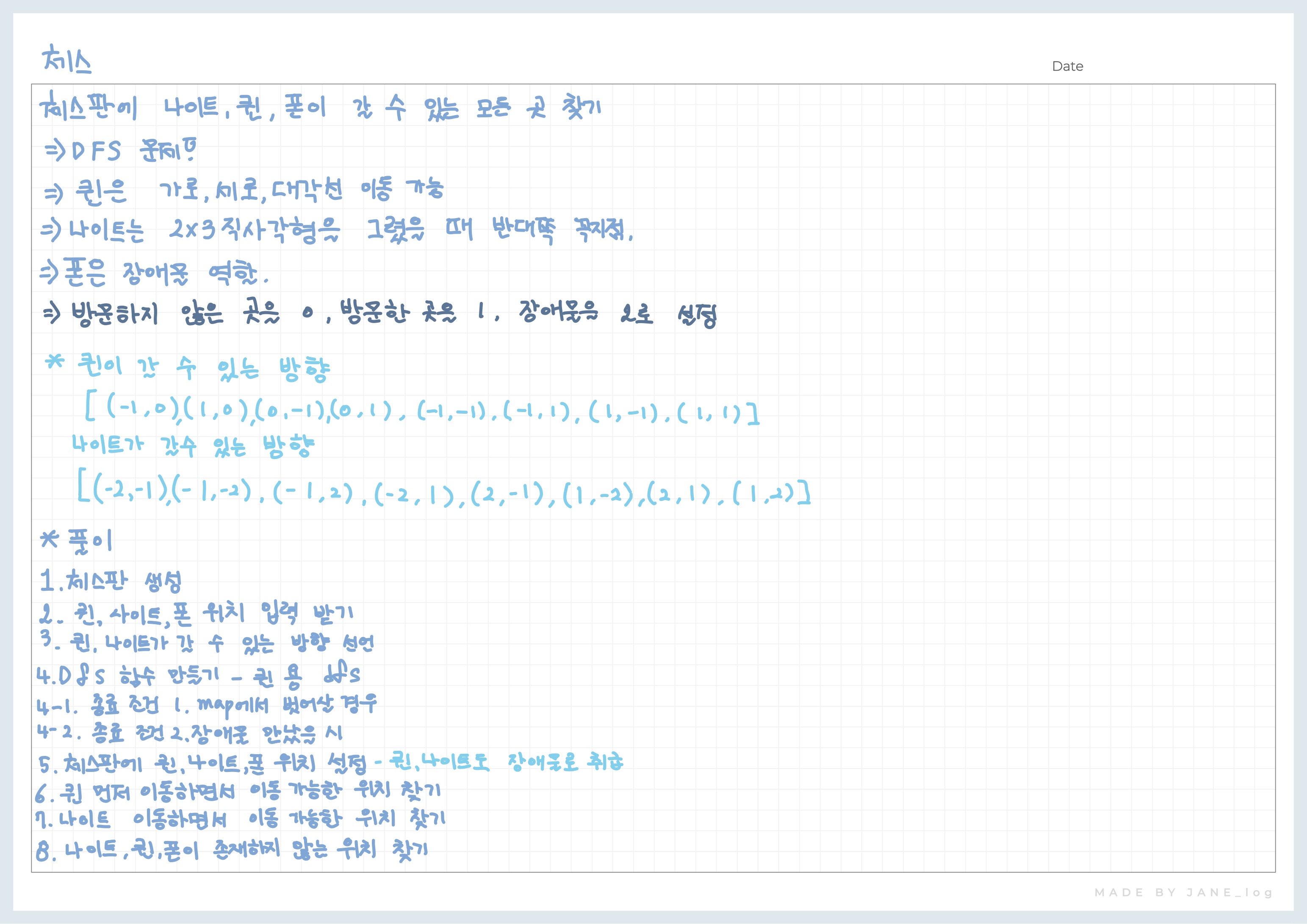 참고로 Queen은 가로, 세로, 대각선으로 갈 수 있는 만큼 최대한 많이 이동을 할 수 있는데 만약 그 중간에 장애물이 있다면 이동을 할 수 없다. 그리고 Knight는 2×3 직사각형을 그렸을 때, 반대쪽 꼭짓점으로 이동을 할 수 있다. 아래 그림과 같은 8칸이 이에 해당한다.