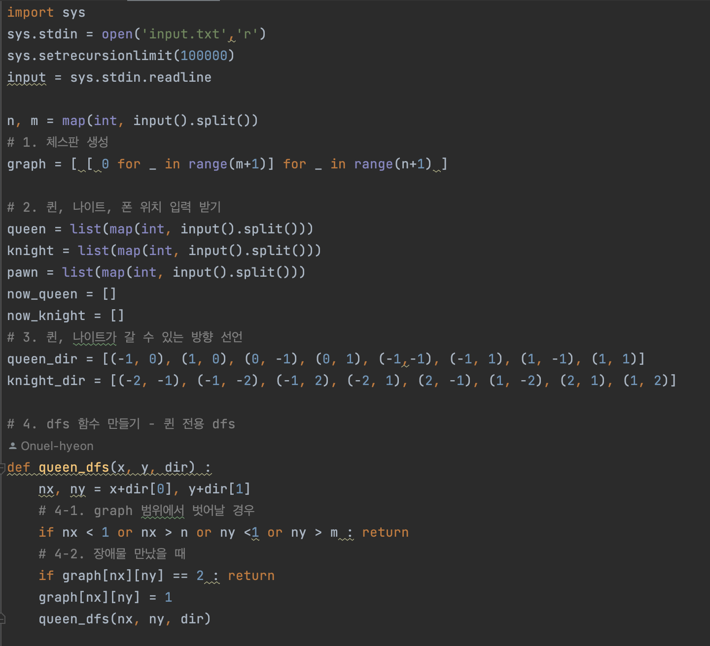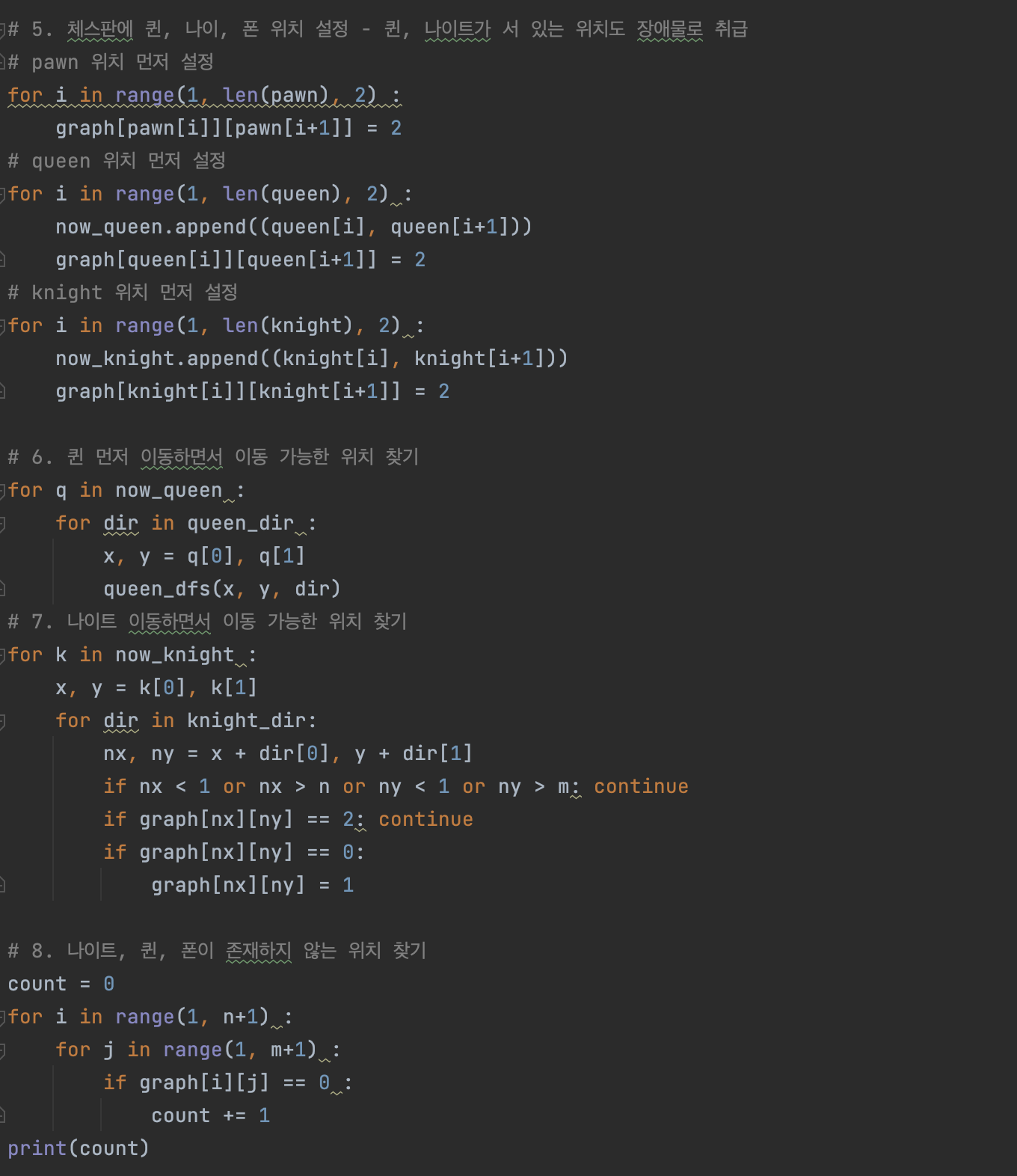 n×m 크기의 체스 판과, 상대팀의 Queen, Knight, Pawn의 위치가 주어져 있을 때, 안전한 칸이 몇 칸인지 세는 프로그램을 작성하시오. (안전한 칸이란 말은 그 곳에 자신의 말이 있어도 잡힐 가능성이 없다는 것이다.)