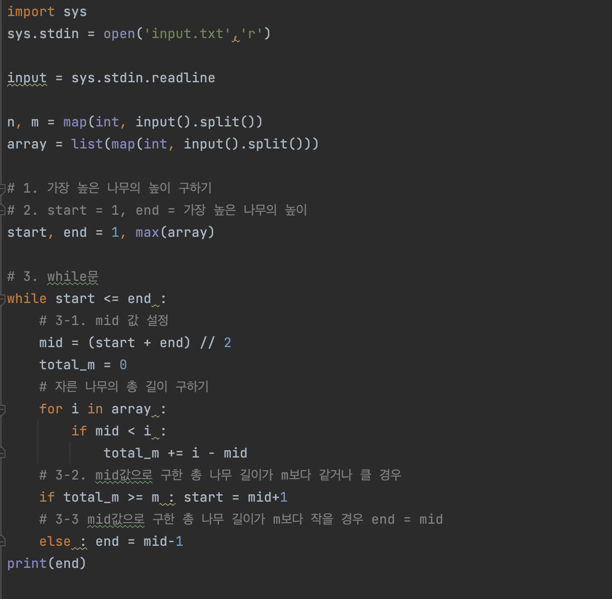 상근이는 환경에 매우 관심이 많기 때문에, 나무를 필요한 만큼만 집으로 가져가려고 한다. 이때, 적어도 M미터의 나무를 집에 가져가기 위해서 절단기에 설정할 수 있는 높이의 최댓값을 구하는 프로그램을 작성하시오.
