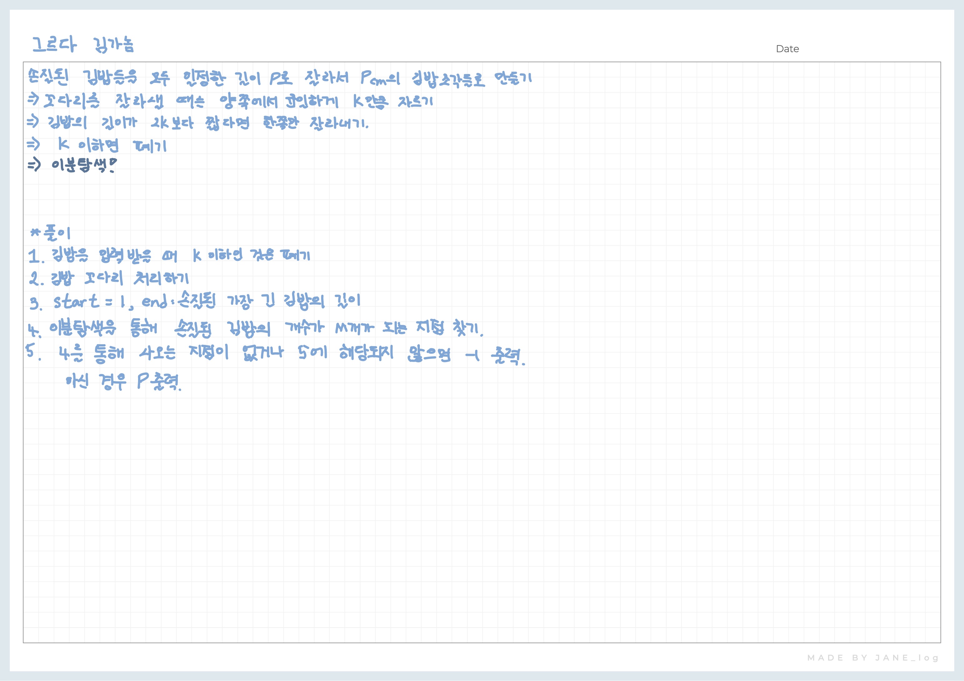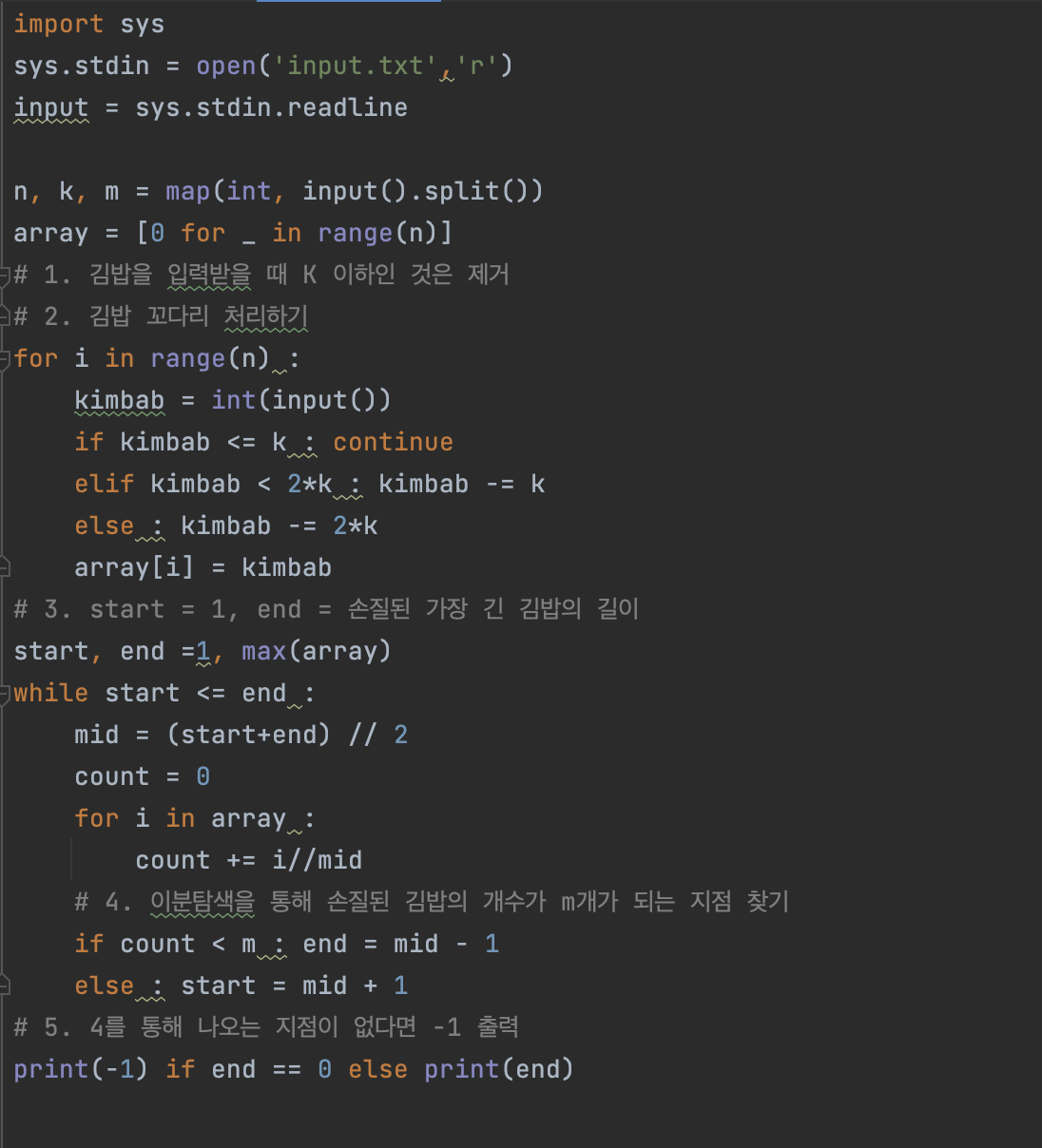 첫 번째 줄에 손질해야 하는 김밥의 개수 N, 꼬다리의 길이 K, 김밥조각의 최소 개수 M이 주어진다. (1 ≤ N ≤ 106, 1 ≤ K, M ≤ 109, N, K, M은 정수) 두 번째 줄부터 김밥의 길이 L이 N개 주어진다.
