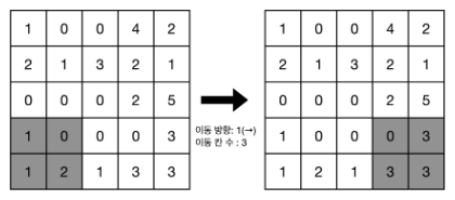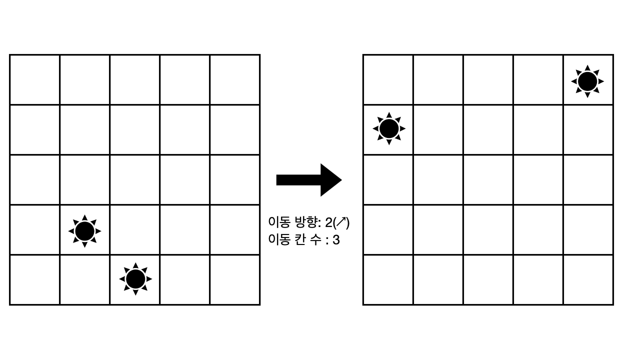 이동 규칙은 이동 방향 d, 이동 칸 수 p로 주어지고, d는 1번부터 8번까지 각각 → ↗ ↑ ↖ ← ↙ ↓ ↘으로 주어집니다.