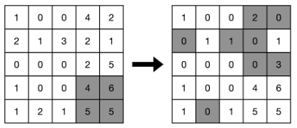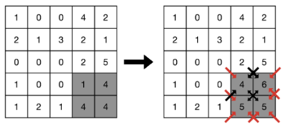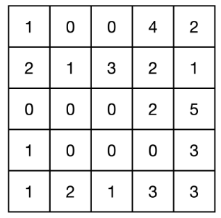 다음과 같이 각기 높이가 다른 리브로수가 주어질 때(높이가 0인 리브로수는 새싹만 존재하는 땅을 의미합니다.), 초기의 특수 영양제의 위치는 아래 음영이 있는 칸이 됩니다. 이때 주어진 이동 규칙에 따라 이동하면 아래의 그림처럼 변합니다.