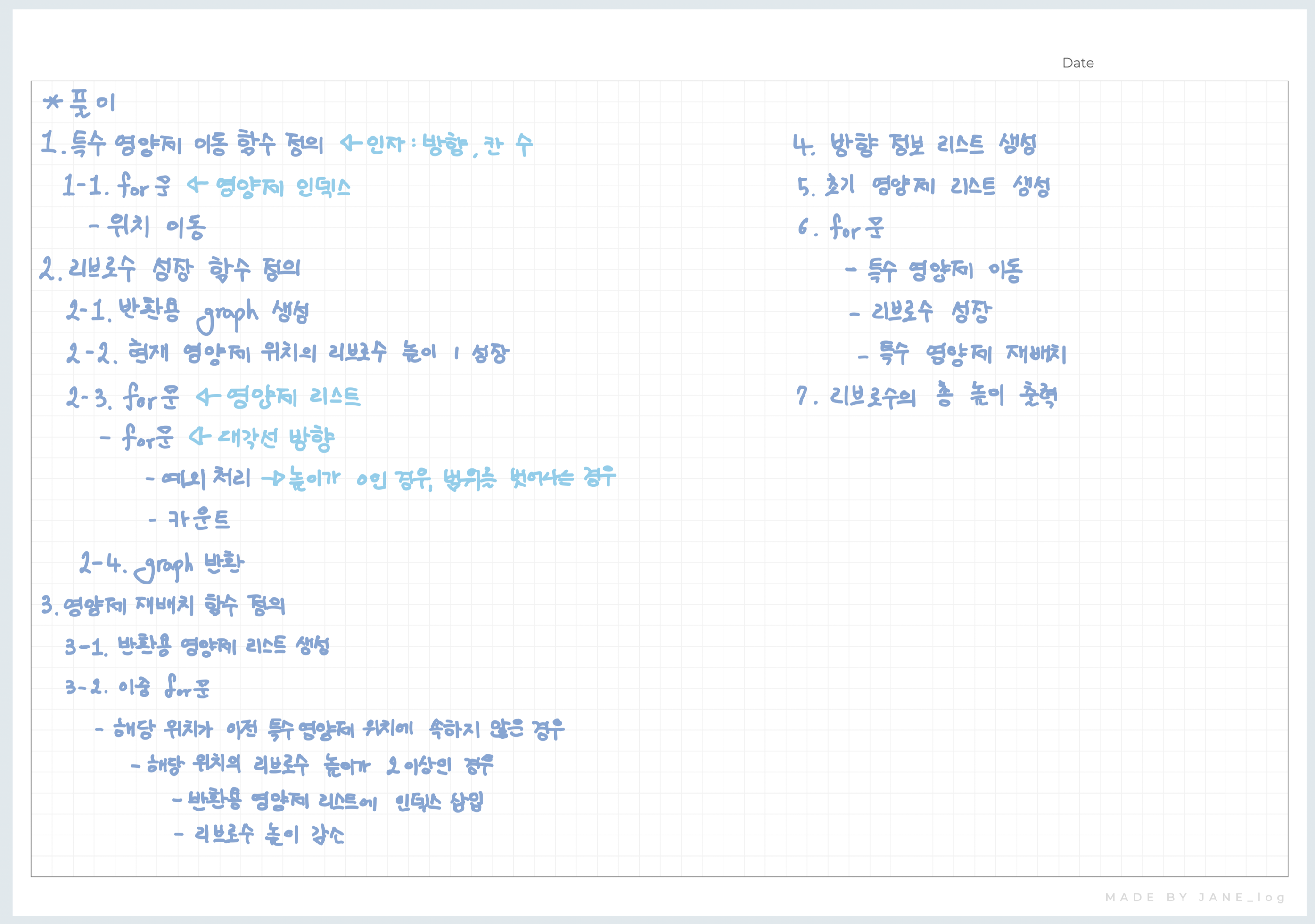 - 특수 영양제를 투입한 리브로수의 대각선으로 인접한 방향에 높이가 1 이상인 리브로수가 있는 만큼 높이가 더 성장합니다. 대각선으로 인접한 방향이 격자를 벗어나는 경우에는 세지 않습니다.