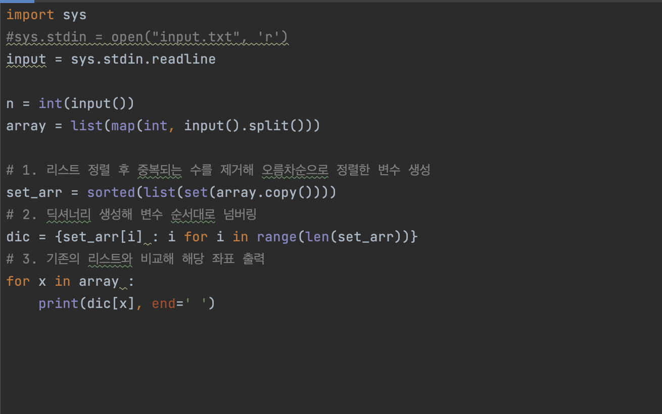 수직선 위에 N개의 좌표 X1, X2, ..., XN이 있다. 이 좌표에 좌표 압축을 적용하려고 한다. Xi를 좌표 압축한 결과 X'i의 값은 Xi > Xj를 만족하는 서로 다른 좌표의 개수와 같아야 한다. X1, X2, ..., XN에 좌
