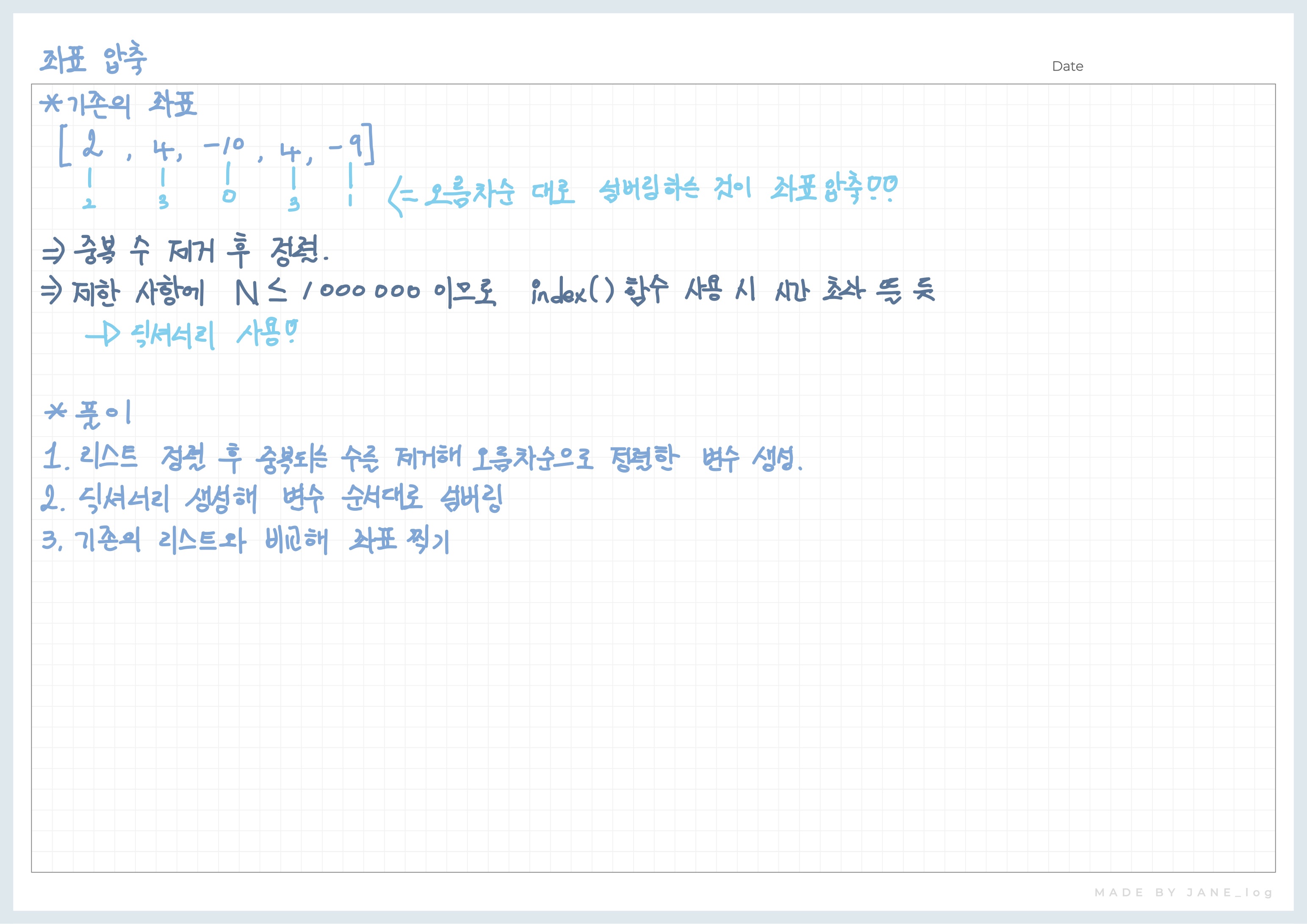 Xi를 좌표 압축한 결과 X'i의 값은 Xi > Xj를 만족하는 서로 다른 좌표의 개수와 같아야 한다.